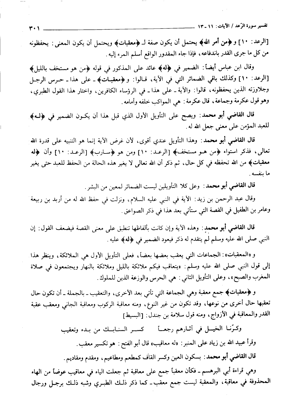 و «المعقبات» : الجماعات التي يعقب بعضها بعضا، فعلى التأويل الأول هي الملائكة، وينظر هذا إلى قول النبي صلى الله عليه وسلم: «يتعاقب فيكم ملائكة بالليل وملائكة بالنهار ويجتمعون في صلاة المغرب والصبح» ، وعلى التأويل الثاني: هي الحرس والوزعة الذين للملوك.
