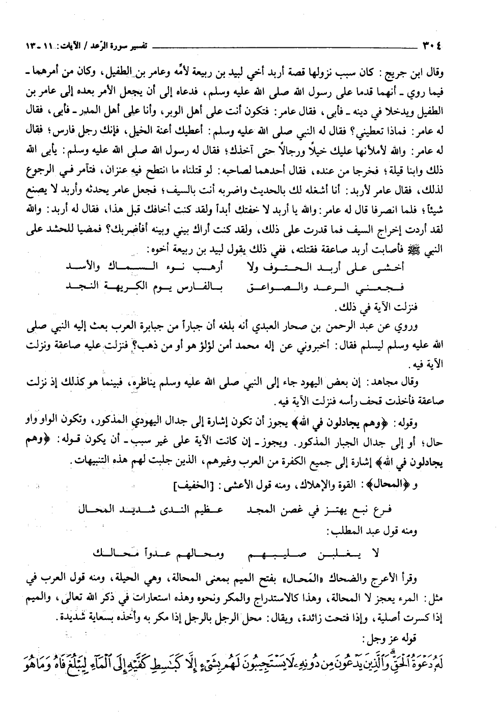 وقال ابن جريج: كان سبب نزولها قصة أربد أخي لبيد بن ربيعة لأمّه وعامر بن الطفيل، وكان من أمرهما- فيما روي- أنهما قدما على رسول الله صلى الله عليه وسلم، فدعاه إلى أن يجعل الأمر بعده إلى عامر بن الطفيل ويدخلا في دينه- فأبى، فقال عامر: فتكون أنت على أهل الوبر، وأنا على أهل المدر- فأبى، فقال له عامر: فماذا تعطيني؟ فقال له النبي صلى الله عليه وسلم: أعطيك أعنة الخيل، فإنك رجل فارس فقال له عامر: والله لأملأنها عليك خيلا ورجالا حتى آخذك فقال له رسول الله صلى الله عليه وسلم: يأبى الله ذلك وابنا قيلة فخرجا من عنده، فقال أحدهما لصاحبه: لو قتلناه ما انتطح فيه عنزان، فتآمر في الرجوع لذلك، فقال عامر لأربد: أنا أشغله لك بالحديث واضربه أنت بالسيف فجعل عامر يحدثه وأربد لا يصنع شيئا فلما انصرفا قال له عامر: والله يا أربد لا خفتك أبدا ولقد كنت أخافك قبل هذا، فقال له أربد: والله لقد أردت إخراج السيف فما قدرت على ذلك، ولقد كنت أراك بيني وبينه أفأضربك؟ فمضيا للحشد على النبي صلى الله عليه وسلم فأصابت أربد صاعقة فقتلته، ففي ذلك يقول لبيد بن ربيعة أخوه: