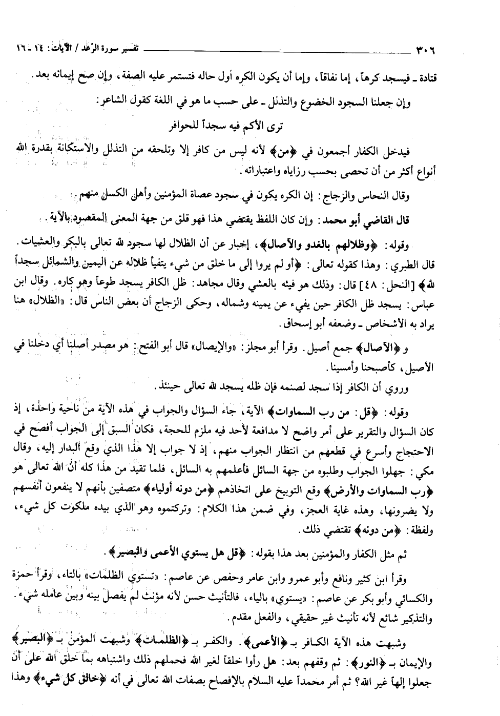 وشبهت هذه الآية الكافر ب الْأَعْمى. والكفر ب الظُّلُماتُ وشبهت المؤمن ب الْبَصِيرُ والإيمان ب النُّورُ: ثم وقفهم بعد: هل رأوا خلقا لغير الله فحملهم ذلك واشتباهه بما خلق الله على أن جعلوا إلها غير الله؟ ثم أمر محمدا عليه السلام بالإفصاح بصفات الله تعالى في أنه خالِقُ كُلِّ شَيْءٍ وهذا