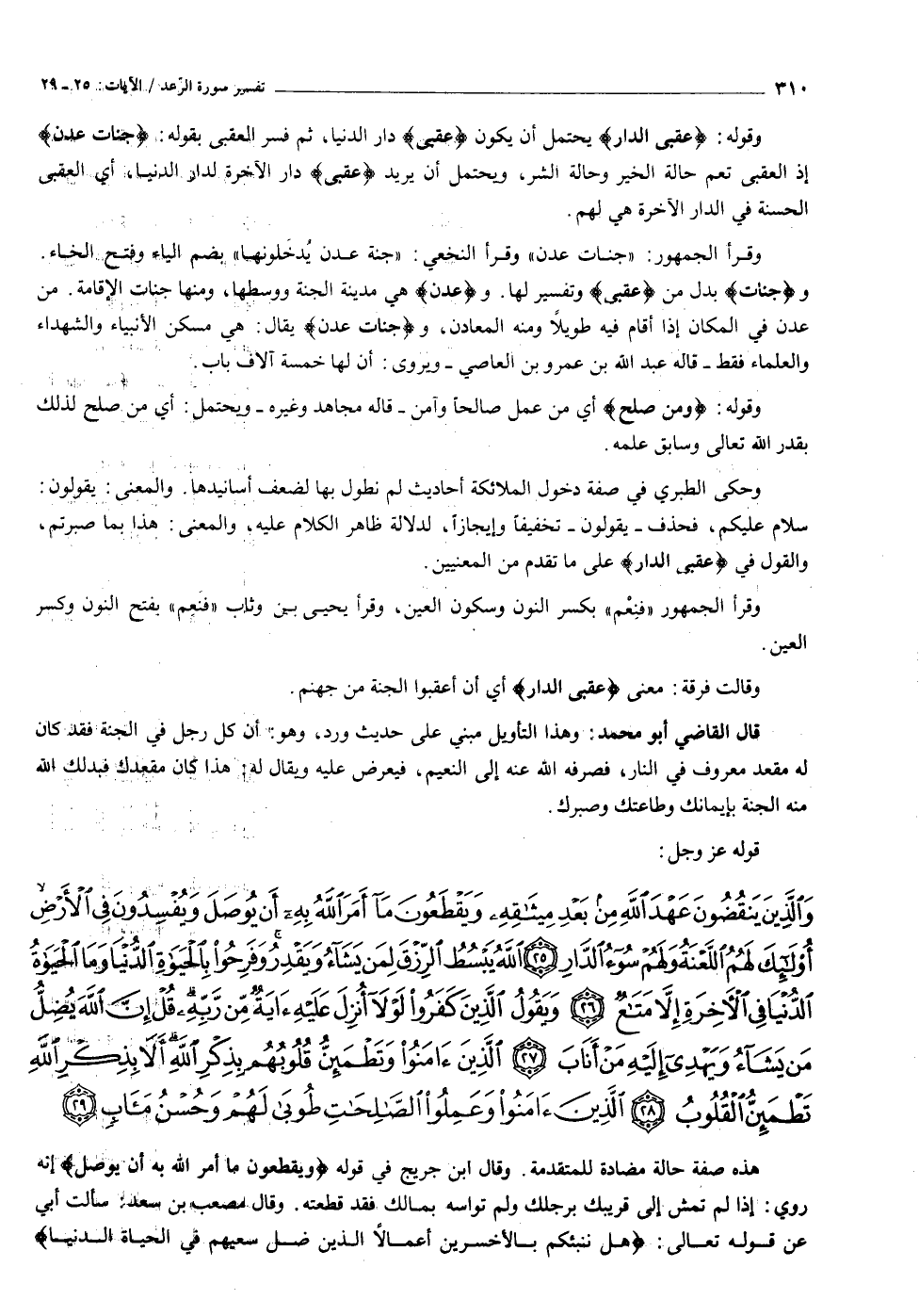 وقوله: عُقْبَى الدَّارِ يحتمل أن يكون عُقْبَى دار الدنيا، ثم فسر العقبى بقوله: جَنَّاتُ عَدْنٍ إذ العقبى تعم حالة الخير وحالة الشر، ويحتمل أن يريد عُقْبَى دار الآخرة لدار الدنيا، أي العقبى الحسنة في الدار الآخرة هي لهم.