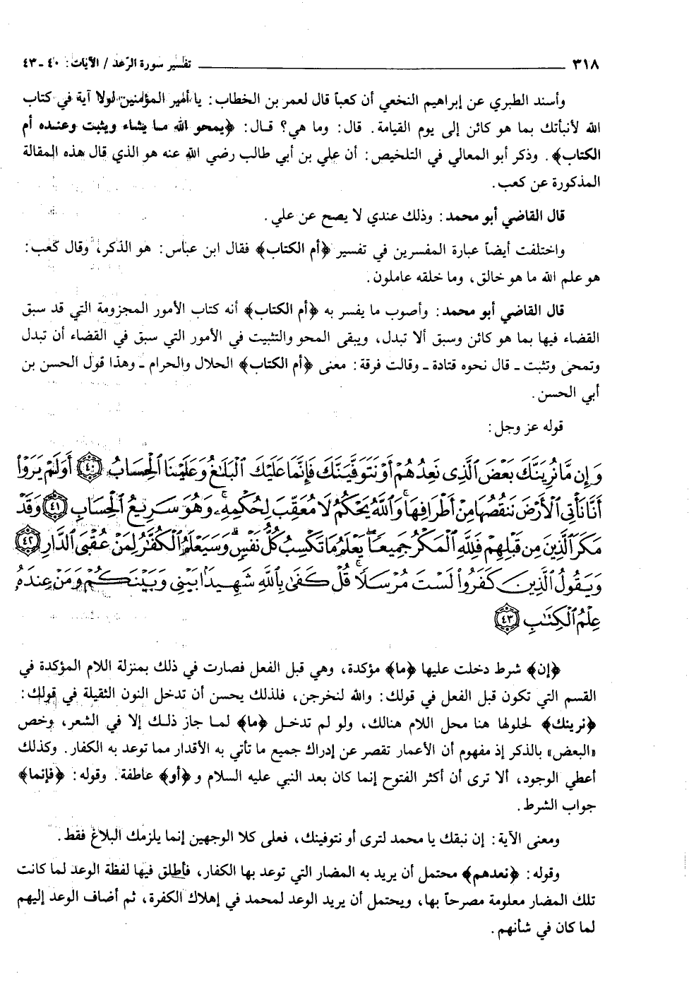وَإِنْ ما نُرِيَنَّكَ بَعْضَ الَّذِي نَعِدُهُمْ أَوْ نَتَوَفَّيَنَّكَ فَإِنَّما عَلَيْكَ الْبَلاغُ وَعَلَيْنَا الْحِسابُ (٤٠) أَوَلَمْ يَرَوْا أَنَّا نَأْتِي الْأَرْضَ نَنْقُصُها مِنْ أَطْرافِها وَاللَّهُ يَحْكُمُ لا مُعَقِّبَ لِحُكْمِهِ وَهُوَ سَرِيعُ الْحِسابِ (٤١) وَقَدْ مَكَرَ الَّذِينَ مِنْ قَبْلِهِمْ فَلِلَّهِ الْمَكْرُ جَمِيعاً يَعْلَمُ ما تَكْسِبُ كُلُّ نَفْسٍ وَسَيَعْلَمُ الْكُفَّارُ لِمَنْ عُقْبَى الدَّارِ (٤٢) وَيَقُولُ الَّذِينَ كَفَرُوا لَسْتَ مُرْسَلاً قُلْ كَفى بِاللَّهِ شَهِيداً بَيْنِي وَبَيْنَكُمْ وَمَنْ عِنْدَهُ عِلْمُ الْكِتابِ (٤٣)