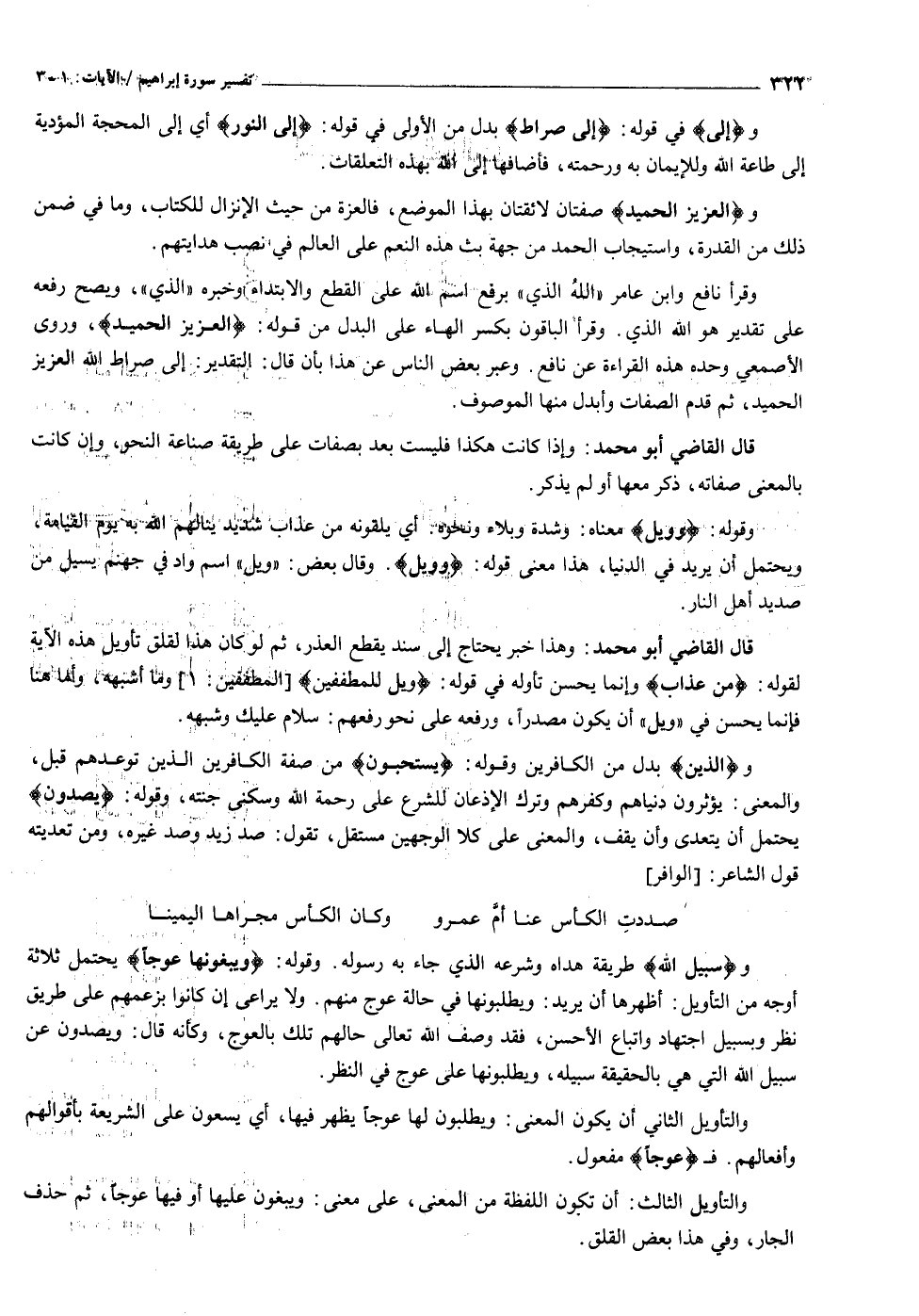 وسَبِيلِ اللَّهِ طريقة هداه وشرعه الذي جاء به رسوله. وقوله: وَيَبْغُونَها عِوَجاً يحتمل ثلاثة أوجه من التأويل: أظهرها أن يريد: ويطلبونها في حالة عوج منهم. ولا يراعى إن كانوا بزعمهم على طريق نظر وبسبيل اجتهاد واتباع الأحسن، فقد وصف الله تعالى حالهم تلك بالعوج، وكأنه قال: ويصدون عن سبيل الله التي هي بالحقيقة سبيله، ويطلبونها على عوج في النظر.