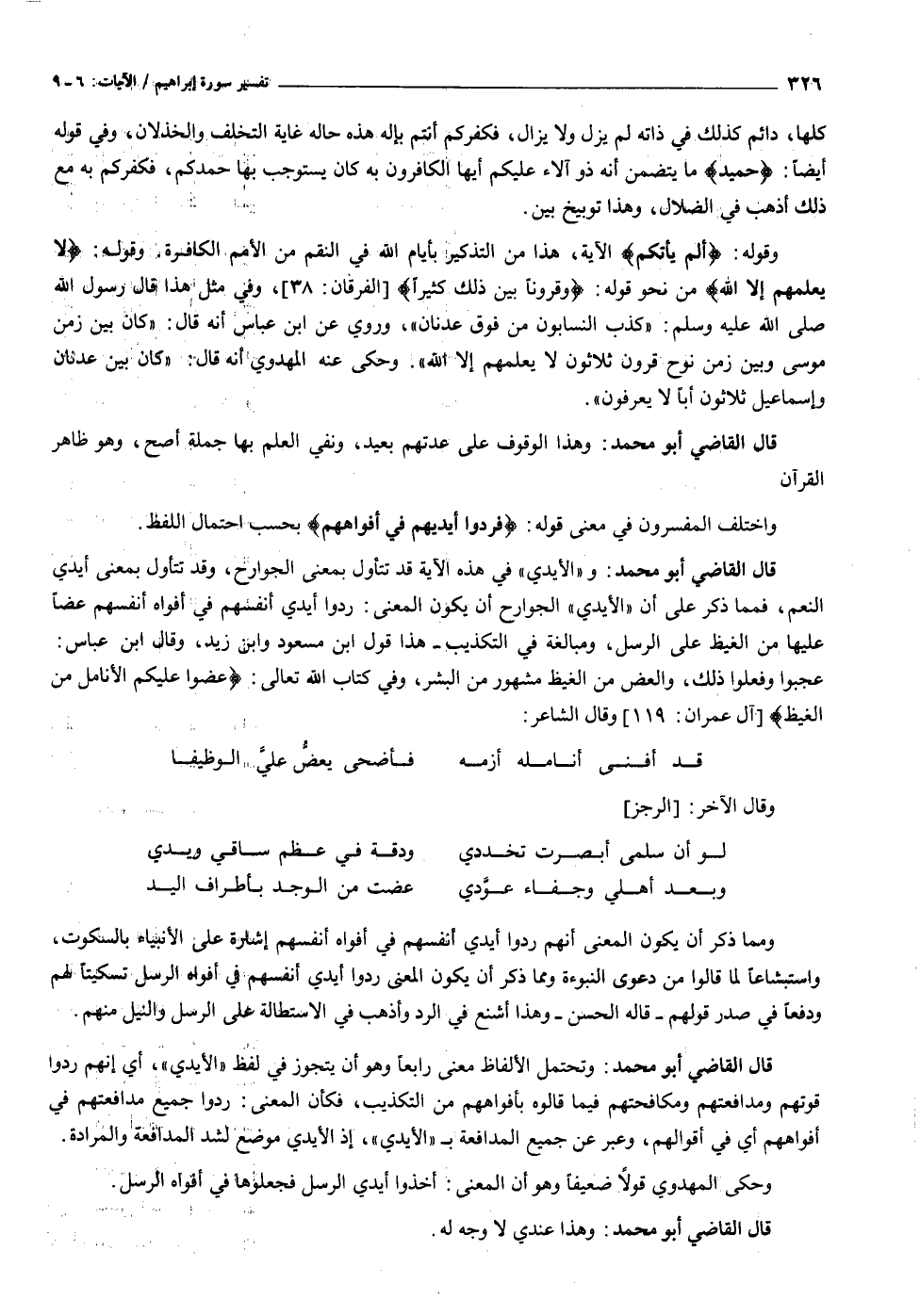 قال القاضي أبو محمد: و «الأيدي» في هذه الآية قد تتأول بمعنى الجوارح، وقد تتأول بمعنى أيدي النعم، فمما ذكر على أن «الأيدي» الجوارح أن يكون المعنى: ردوا أيدي أنفسهم في أفواه أنفسهم عضا عليها من الغيظ على الرسل، ومبالغة في التكذيب- هذا قول ابن مسعود وابن زيد، وقال ابن عباس: