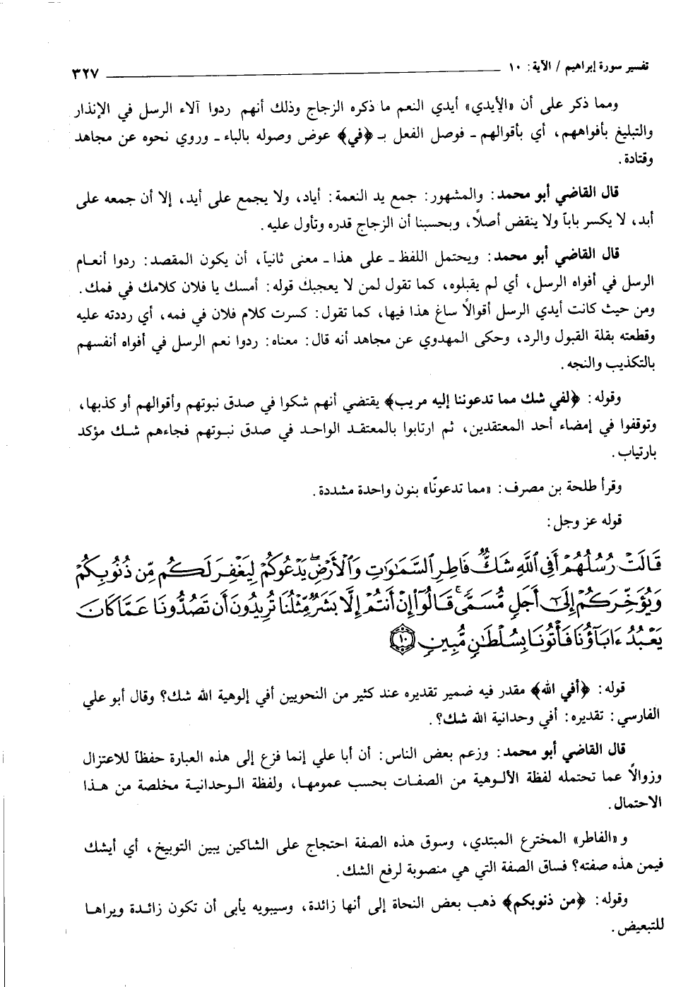 قالَتْ رُسُلُهُمْ أَفِي اللَّهِ شَكٌّ فاطِرِ السَّماواتِ وَالْأَرْضِ يَدْعُوكُمْ لِيَغْفِرَ لَكُمْ مِنْ ذُنُوبِكُمْ وَيُؤَخِّرَكُمْ إِلى أَجَلٍ مُسَمًّى قالُوا إِنْ أَنْتُمْ إِلاَّ بَشَرٌ مِثْلُنا تُرِيدُونَ أَنْ تَصُدُّونا عَمَّا كانَ يَعْبُدُ آباؤُنا فَأْتُونا بِسُلْطانٍ مُبِينٍ (١٠)