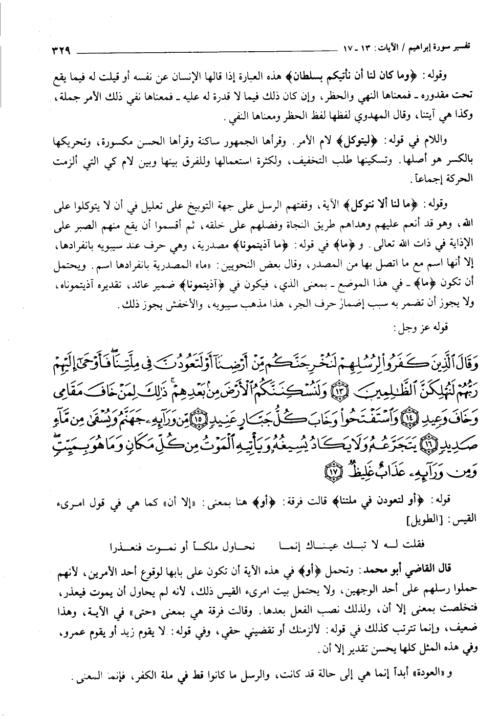 وَقالَ الَّذِينَ كَفَرُوا لِرُسُلِهِمْ لَنُخْرِجَنَّكُمْ مِنْ أَرْضِنا أَوْ لَتَعُودُنَّ فِي مِلَّتِنا فَأَوْحى إِلَيْهِمْ رَبُّهُمْ لَنُهْلِكَنَّ الظَّالِمِينَ (١٣) وَلَنُسْكِنَنَّكُمُ الْأَرْضَ مِنْ بَعْدِهِمْ ذلِكَ لِمَنْ خافَ مَقامِي وَخافَ وَعِيدِ (١٤) وَاسْتَفْتَحُوا وَخابَ كُلُّ جَبَّارٍ عَنِيدٍ (١٥) مِنْ وَرائِهِ جَهَنَّمُ وَيُسْقى مِنْ ماءٍ صَدِيدٍ (١٦) يَتَجَرَّعُهُ وَلا يَكادُ يُسِيغُهُ وَيَأْتِيهِ الْمَوْتُ مِنْ كُلِّ مَكانٍ وَما هُوَ بِمَيِّتٍ وَمِنْ وَرائِهِ عَذابٌ غَلِيظٌ (١٧)