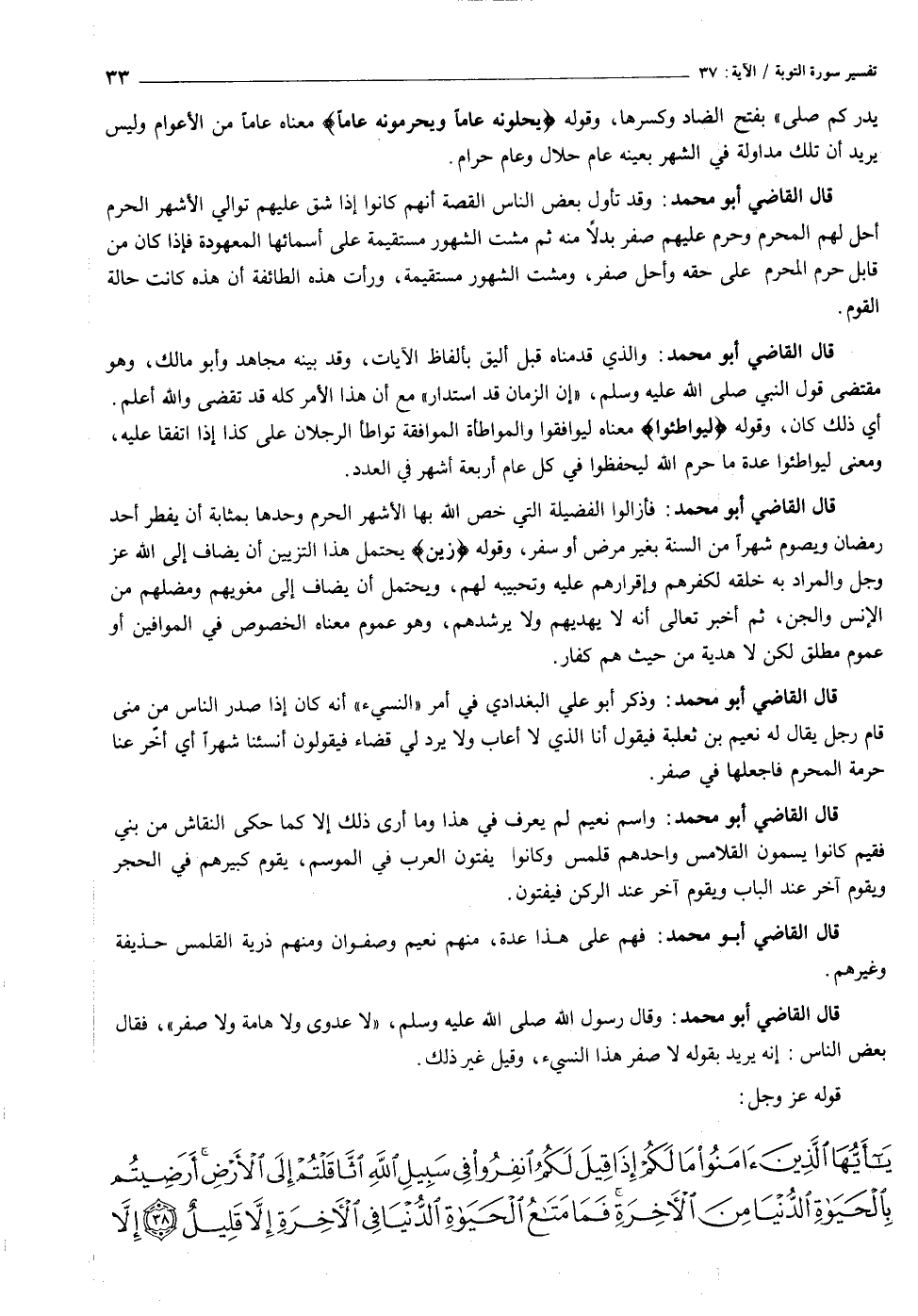 قال القاضي أبو محمد: وقد تأول بعض الناس القصة أنهم كانوا إذا شق عليهم توالي الأشهر الحرم أحل لهم المحرم وحرم عليهم صفر بدلا منه ثم مشت الشهور مستقيمة على أسمائها المعهودة فإذا كان من قابل حرم المحرم على حقه وأحل صفر، ومشت الشهور مستقيمة، ورأت هذه الطائفة أن هذه كانت حالة القوم.
