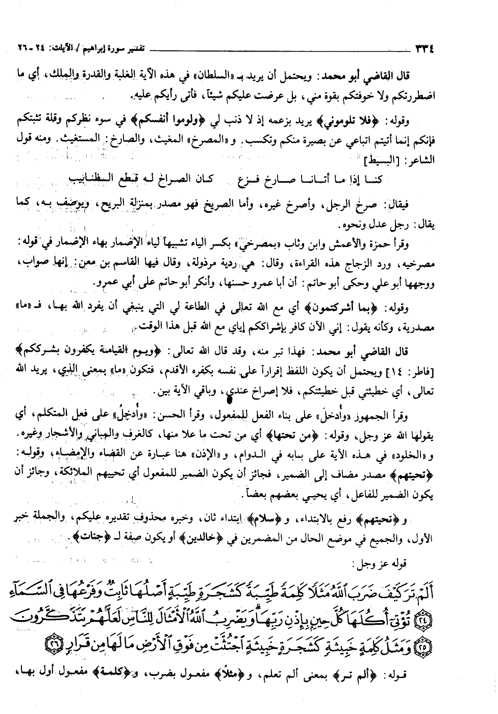 وقوله: فَلا تَلُومُونِي يريد بزعمه إذ لا ذنب لي وَلُومُوا أَنْفُسَكُمْ في سوء نظركم وقلة تثبتكم فإنكم إنما أتيتم اتباعي عن بصيرة منكم وتكسب. و «المصرخ» المغيث، والصارخ: المستغيث. ومنه قول الشاعر: [البسيط]