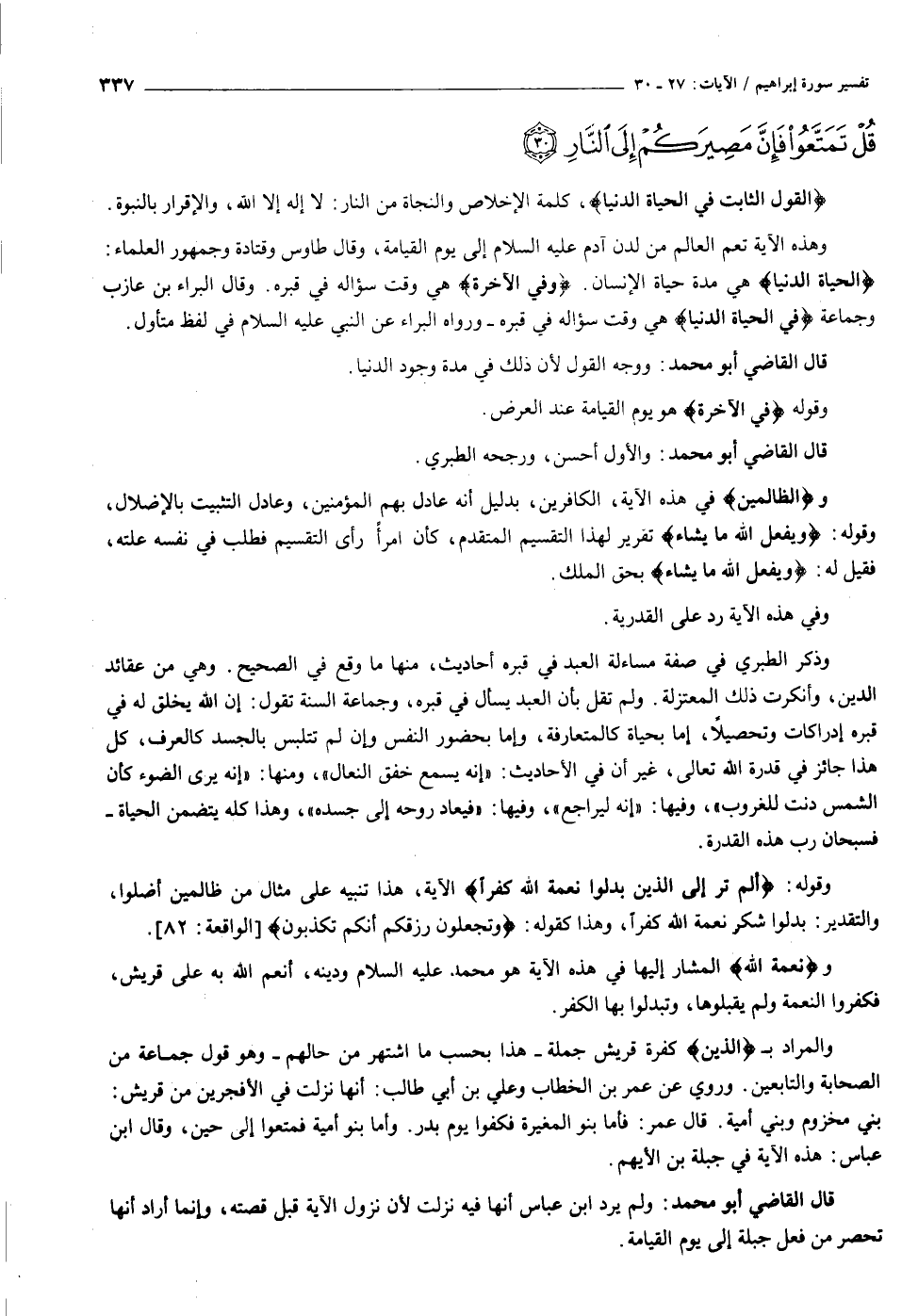 وذكر الطبري في صفة مساءلة العبد في قبره أحاديث، منها ما وقع في الصحيح. وهي من عقائد الدين، وأنكرت ذلك المعتزلة. ولم تقل بأن العبد يسأل في قبره، وجماعة السنة تقول: إن الله يخلق له في قبره إدراكات وتحصيلا، إما بحياة كالمتعارفة، وإما بحضور النفس وإن لم تتلبس بالجسد كالعرف، كل هذا جائز في قدرة الله تعالى، غير أن في الأحاديث: «إنه يسمع خفق النعال» ، ومنها: «إنه يرى الضوء كأن الشمس دنت للغروب» ، وفيها: «إنه ليراجع» ، وفيها: «فيعاد روحه إلى جسده» ، وهذا كله يتضمن الحياة- فسبحان رب هذه القدرة.