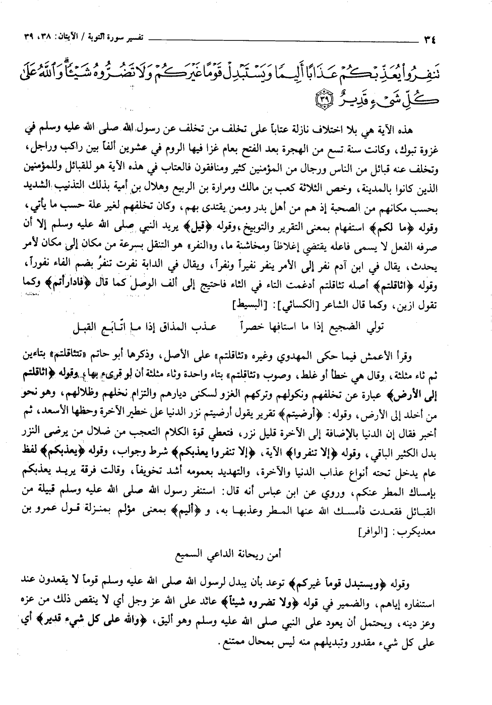 وقرأ الأعمش فيما حكى المهدوي وغيره «تثاقلتم» على الأصل، وذكرها أبو حاتم «تتثاقلتم» بتاءين ثم ثاء مثلثة، وقال هي خطأ أو غلط، وصوب «تثاقلتم» بتاء واحدة وثاء مثلثة أن لو قرىء بها، وقوله اثَّاقَلْتُمْ إِلَى الْأَرْضِ عبارة عن تخلفهم ونكولهم وتركهم الغزو لسكنى ديارهم والتزام نخلهم وظلالهم، وهو نحو من أخلد إلى الأرض، وقوله: أَرَضِيتُمْ تقرير يقول أرضيتم نزر الدنيا على خطير الآخرة وحظها الأسعد، ثم أخبر فقال إن الدنيا بالإضافة إلى الآخرة قليل نزر، فتعطي قوة الكلام التعجب من ضلال من يرضى النزر بدل الكثير الباقي، وقوله إِلَّا تَنْفِرُوا الآية، إِلَّا تَنْفِرُوا يُعَذِّبْكُمْ شرط وجواب، وقوله يُعَذِّبْكُمْ لفظ عام يدخل تحته أنواع عذاب الدنيا والآخرة، والتهديد بعمومه أشد تخويفا، وقالت فرقة يريد يعذبكم بإمساك المطر عنكم، وروي عن ابن عباس أنه قال: استنفر رسول الله صلى الله عليه وسلم قبيلة من القبائل فقعدت فأمسك الله عنها المطر وعذبها به، و «أليم» بمعنى مؤلم بمنزلة قول عمرو بن معديكرب: [الوافر] أمن ريحانة الداعي السميع وقوله وَيَسْتَبْدِلْ قَوْماً غَيْرَكُمْ توعد بأن يبدل لرسول الله صلى الله عليه وسلم قوما لا يقعدون عند استنفاره إياهم، والضمير في قوله وَلا تَضُرُّوهُ شَيْئاً عائد على الله عز وجل أي لا ينقص ذلك من عزه وعز دينه، ويحتمل أن يعود على النبي صلى الله عليه وسلم وهو أليق، وَاللَّهُ عَلى كُلِّ شَيْءٍ قَدِيرٌ أي على كل شيء مقدور وتبديلهم منه ليس بمحال ممتنع.