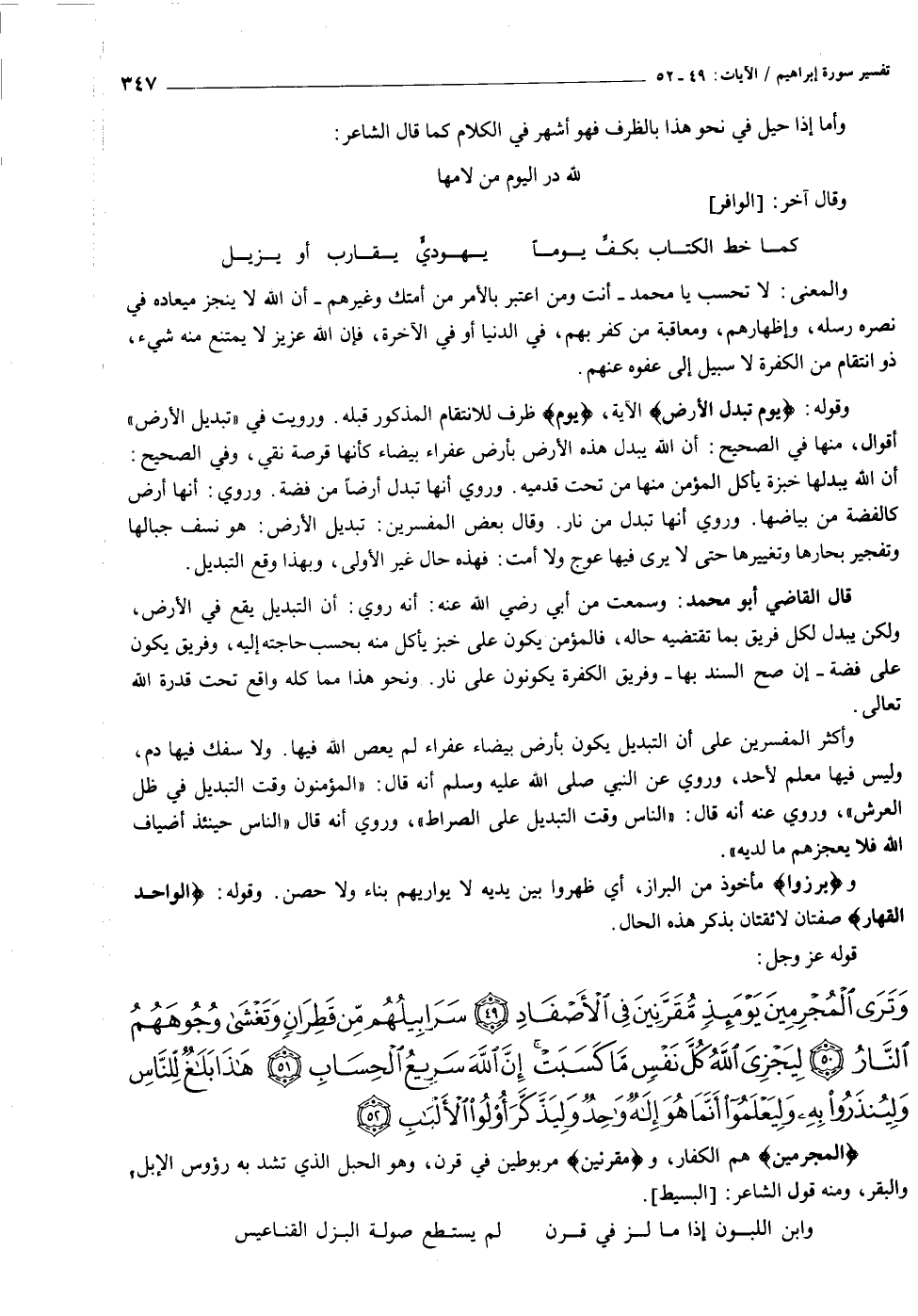 وَتَرَى الْمُجْرِمِينَ يَوْمَئِذٍ مُقَرَّنِينَ فِي الْأَصْفادِ (٤٩) سَرابِيلُهُمْ مِنْ قَطِرانٍ وَتَغْشى وُجُوهَهُمُ النَّارُ (٥٠) لِيَجْزِيَ اللَّهُ كُلَّ نَفْسٍ ما كَسَبَتْ إِنَّ اللَّهَ سَرِيعُ الْحِسابِ (٥١) هذا بَلاغٌ لِلنَّاسِ وَلِيُنْذَرُوا بِهِ وَلِيَعْلَمُوا أَنَّما هُوَ إِلهٌ واحِدٌ وَلِيَذَّكَّرَ أُولُوا الْأَلْبابِ (٥٢)