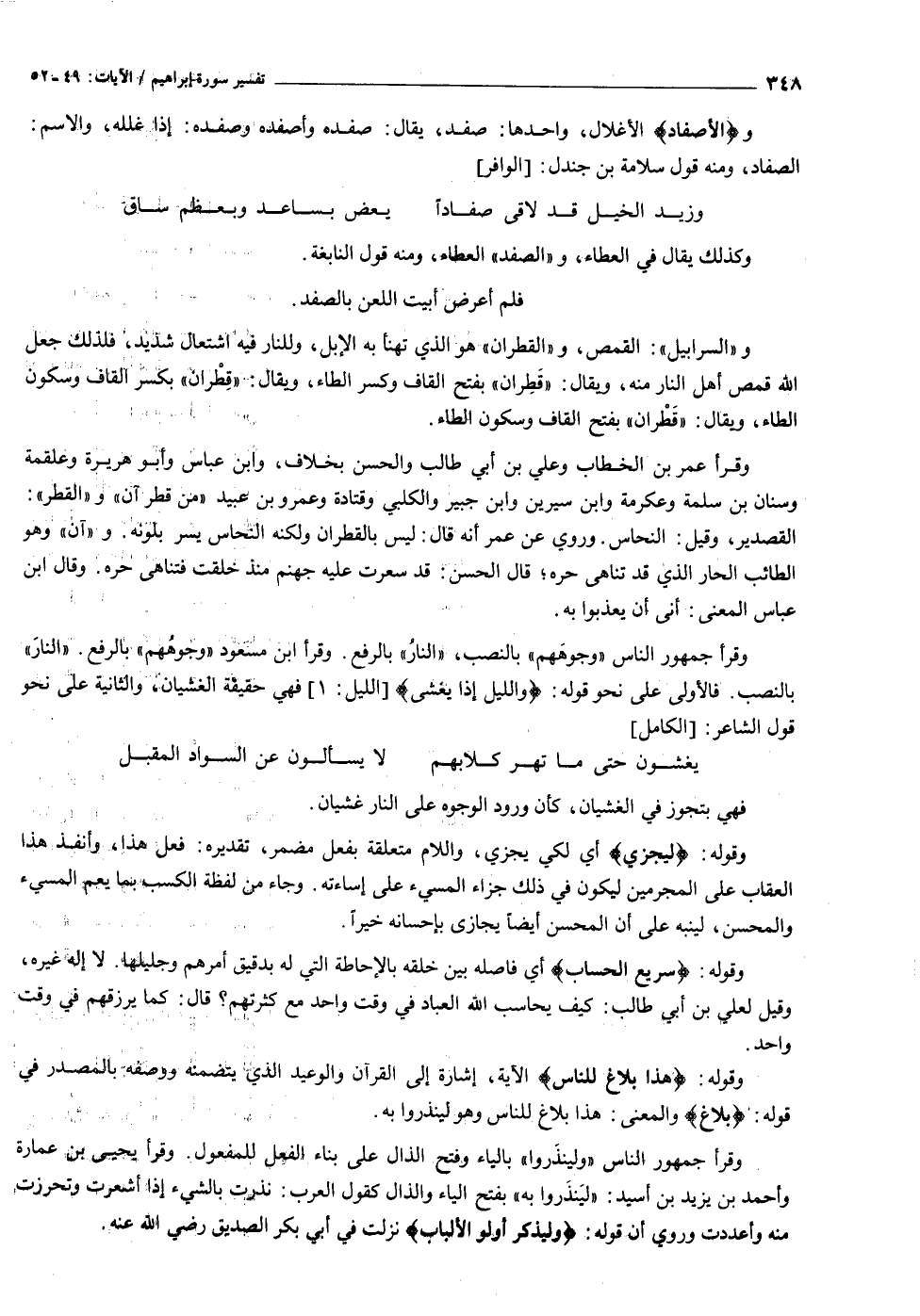 و «السرابيل» : القمص، و «القطران» هو الذي تهنأ به الإبل، وللنار فيه اشتعال شديد، فلذلك جعل الله قمص أهل النار منه، ويقال: «قطران» بفتح القاف وكسر الطاء، ويقال: «قطران» بكسر القاف وسكون الطاء، ويقال: «قطران» بفتح القاف وسكون الطاء.
