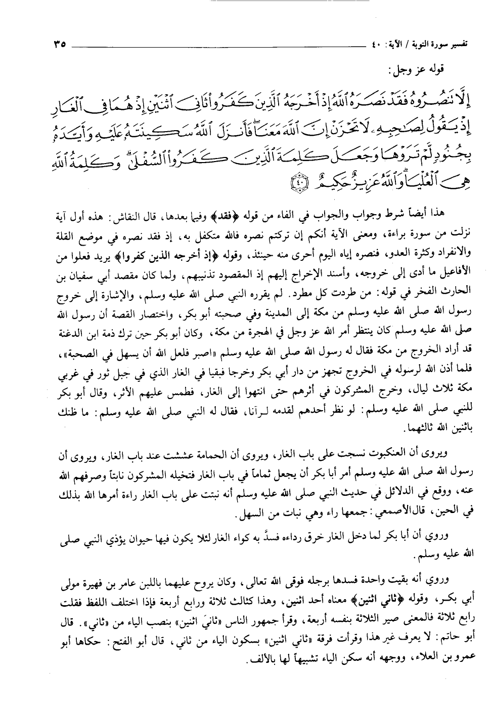 إِلاَّ تَنْصُرُوهُ فَقَدْ نَصَرَهُ اللَّهُ إِذْ أَخْرَجَهُ الَّذِينَ كَفَرُوا ثانِيَ اثْنَيْنِ إِذْ هُما فِي الْغارِ إِذْ يَقُولُ لِصاحِبِهِ لا تَحْزَنْ إِنَّ اللَّهَ مَعَنا فَأَنْزَلَ اللَّهُ سَكِينَتَهُ عَلَيْهِ وَأَيَّدَهُ بِجُنُودٍ لَمْ تَرَوْها وَجَعَلَ كَلِمَةَ الَّذِينَ كَفَرُوا السُّفْلى وَكَلِمَةُ اللَّهِ هِيَ الْعُلْيا وَاللَّهُ عَزِيزٌ حَكِيمٌ (٤٠)