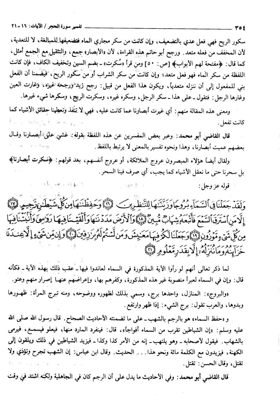 وَلَقَدْ جَعَلْنا فِي السَّماءِ بُرُوجاً وَزَيَّنَّاها لِلنَّاظِرِينَ (١٦) وَحَفِظْناها مِنْ كُلِّ شَيْطانٍ رَجِيمٍ (١٧) إِلاَّ مَنِ اسْتَرَقَ السَّمْعَ فَأَتْبَعَهُ شِهابٌ مُبِينٌ (١٨) وَالْأَرْضَ مَدَدْناها وَأَلْقَيْنا فِيها رَواسِيَ وَأَنْبَتْنا فِيها مِنْ كُلِّ شَيْءٍ مَوْزُونٍ (١٩) وَجَعَلْنا لَكُمْ فِيها مَعايِشَ وَمَنْ لَسْتُمْ لَهُ بِرازِقِينَ (٢٠)