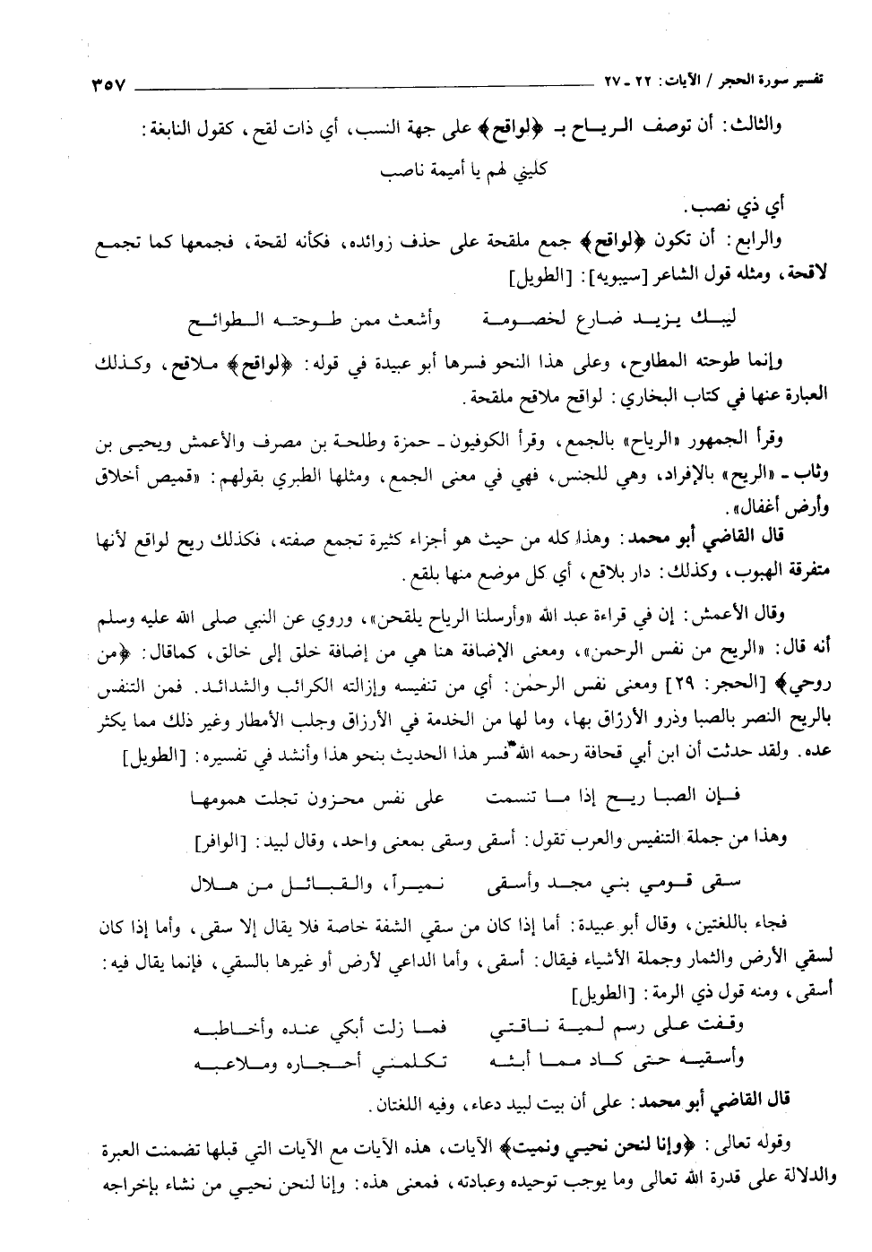 وقال الأعمش: إن في قراءة عبد الله «وأرسلنا الرياح يلقحن» ، وروي عن النبي صلى الله عليه وسلم أنه قال: «الريح من نفس الرحمن» ، ومعنى الإضافة هنا هي من إضافة خلق إلى خالق، كما قال: مِنْ رُوحِي [الحجر: ٢٩] ومعنى نفس الرحمن: أي من تنفيسه وإزالته الكرائب والشدائد. فمن التنفس بالريح النصر بالصبا وذرو الأرزاق بها، وما لها من الخدمة في الأرزاق وجلب الأمطار وغير ذلك مما يكثر عده. ولقد حدثت أن ابن أبي قحافة رحمه الله فسر هذا الحديث بنحو هذا وأنشد في تفسيره: [الطويل]