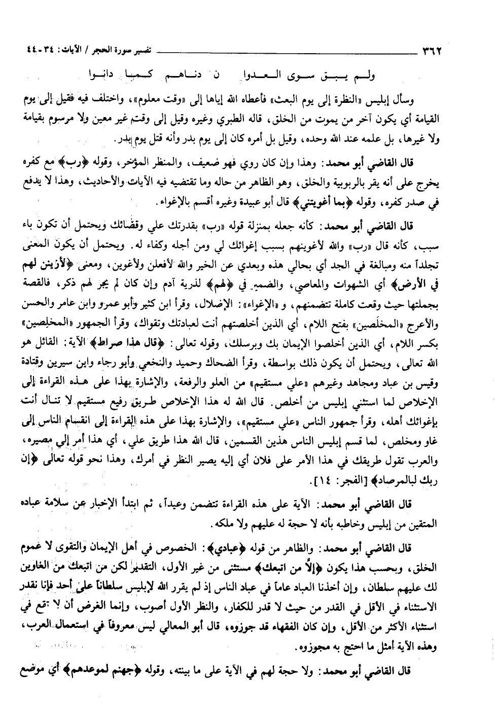 قال القاضي أبو محمد: والظاهر من قوله عِبادِي: الخصوص في أهل الإيمان والتقوى لا عموم الخلق، وبحسب هذا يكون إِلَّا مَنِ اتَّبَعَكَ مستثنى من غير الأول، التقدير لكن من اتبعك من الغاوين لك عليهم سلطان، وإن أخذنا العباد عاما في عباد الناس إذ لم يقرر الله لإبليس سلطانا على أحد فإنا نقدر الاستثناء في الأقل في القدر من حيث لا قدر للكفار، والنظر الأول أصوب، وإنما الغرض أن لا تقع في استثناء الأكثر من الأقل، وإن كان الفقهاء قد جوزوه، قال أبو المعالي ليس معروفا في استعمال العرب، وهذه الآية أمثل ما احتج به مجوزوه.
