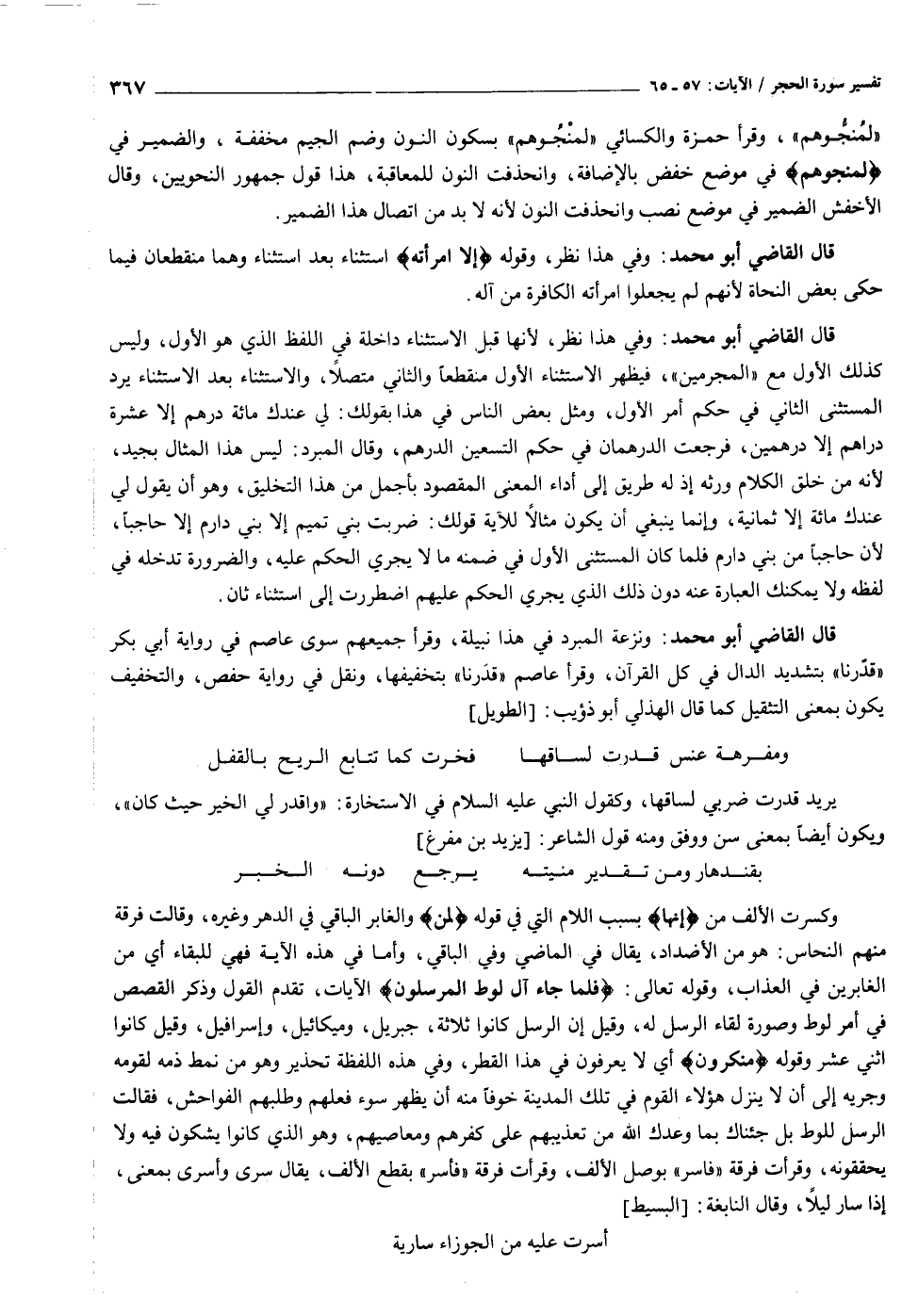 قال القاضي أبو محمد: وفي هذا نظر، لأنها قبل الاستثناء داخلة في اللفظ الذي هو الأول، وليس كذلك الأول مع «المجرمين» ، فيظهر الاستثناء الأول منقطعا والثاني متصلا، والاستثناء بعد الاستثناء يرد المستثنى الثاني في حكم أمر الأول، ومثل بعض الناس في هذا بقولك: لي عندك مائة درهم إلا عشرة دراهم إلا درهمين، فرجعت الدرهمان في حكم التسعين الدرهم، وقال المبرد: ليس هذا المثال بجيد، لأنه من خلق الكلام ورثه إذ له طريق إلى أداء المعنى المقصود بأجمل من هذا التخليق، وهو أن يقول لي عندك مائة إلا ثمانية، وإنما ينبغي أن يكون مثالا للآية قولك: ضربت بني تميم إلا بني دارم إلا حاجبا، لأن حاجبا من بني دارم فلما كان المستثنى الأول في ضمنه ما لا يجري الحكم عليه، والضرورة تدخله في لفظه ولا يمكنك العبارة عنه دون ذلك الذي يجري الحكم عليهم اضطررت إلى استثناء ثان.