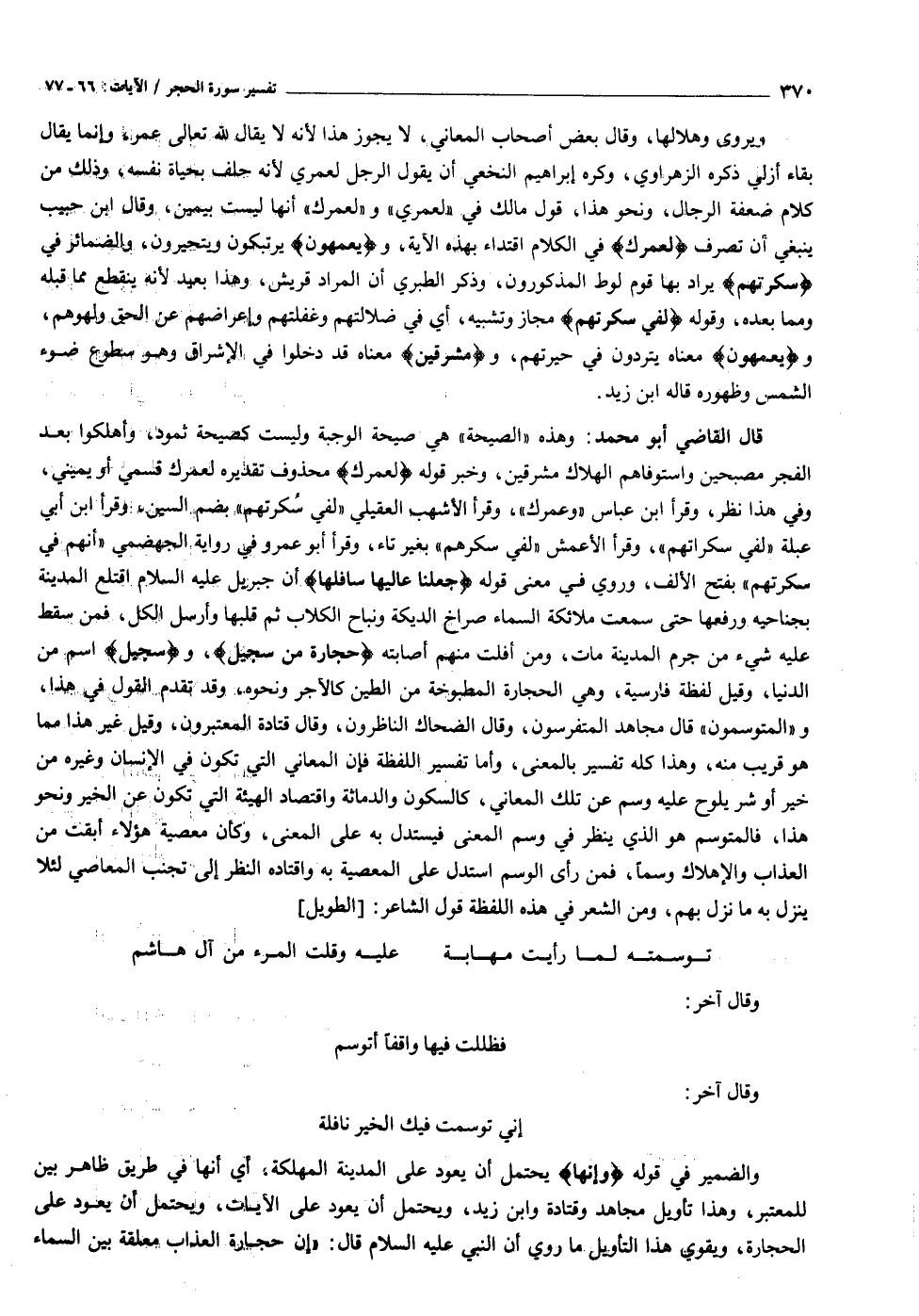 قال القاضي أبو محمد: وهذه «الصيحة» هي صيحة الوجبة وليست كصيحة ثمود، وأهلكوا بعد الفجر مصبحين واستوفاهم الهلاك مشرقين، وخبر قوله لَعَمْرُكَ محذوف تقديره لعمرك قسمي أو يميني، وفي هذا نظر، وقرأ ابن عباس «وعمرك» ، وقرأ الأشهب العقيلي «لفي سكرتهم» بضم السين، وقرأ ابن أبي عبلة «لفي سكراتهم» ، وقرأ الأعمش «لفي سكرهم» بغير تاء، وقرأ أبو عمرو في رواية الجهضمي «أنهم في سكرتهم» بفتح الألف، وروي في معنى قوله فَجَعَلْنا عالِيَها سافِلَها أن جبريل عليه السلام اقتلع المدينة بجناحيه ورفعها حتى سمعت ملائكة السماء صراخ الديكة ونباح الكلاب ثم قلبها وأرسل الكل، فمن سقط عليه شيء من جرم المدينة مات، ومن أفلت منهم أصابته حِجارَةً مِنْ سِجِّيلٍ، وسِجِّيلٍ اسم من الدنيا، وقيل لفظة فارسية، وهي الحجارة المطبوخة من الطين كالآجر ونحوه، وقد تقدم القول في هذا، و «المتوسمون» قال مجاهد المتفرسون، وقال الضحاك الناظرون، وقال قتادة المعتبرون، وقيل غير هذا مما هو قريب منه، وهذا كله تفسير بالمعنى، وأما تفسير اللفظة فإن المعاني التي تكون في الإنسان وغيره من خير أو شر يلوح عليه وسم عن تلك المعاني، كالسكون والدماثة واقتصاد الهيئة التي تكون عن الخير ونحو هذا، فالمتوسم هو الذي ينظر في وسم المعنى فيستدل به على المعنى، وكأن معصية هؤلاء أبقت من العذاب والإهلاك وسما، فمن رأى الوسم استدل على المعصية به واقتاده النظر إلى تجنب المعاصي لئلا ينزل به ما نزل بهم، ومن الشعر في هذه اللفظة قول الشاعر: [الطويل]