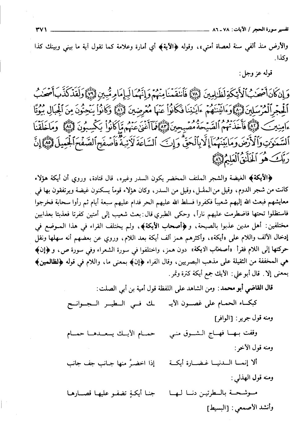 الْأَيْكَةِ الغيضة والشجر الملتف المخضر يكون السدر وغيره، قال قتادة، وروي أن أيكة هؤلاء كانت من شجر الدوم، وقيل من المقل، وقيل من السدر، وكان هؤلاء قوما يسكنون غيضة ويرتفقون بها في معايشهم فبعث الله إليهم شعيبا فكفروا فسلط الله عليهم الحر فدام عليهم سبعة أيام ثم رأوا سحابة فخرجوا فاستظلوا تحتها فاضطرمت عليهم نارا، وحكى الطبري قال: بعث شعيب إلى أمتين كفرتا فعذبتا بعذابين مختلفين: أهل مدين عذبوا بالصيحة، وأَصْحابُ الْأَيْكَةِ، ولم يختلف القراء في هذا الموضع في إدخال الألف واللام على «أيكة» ، وأكثرهم همز ألف أيكة بعد اللام، وروي عن بعضهم أنه سهلها ونقل حركتها إلى اللام فقرأ «أصحاب الأيكة» دون همز، واختلفوا في سورة الشعراء وفي سورة ص، وإِنْ هي المخففة من الثقيلة على مذهب البصريين، وقال الفراء إِنْ بمعنى ما، واللام في قوله لَظالِمِينَ بمعنى إلا. قال أبو علي: الأيك جمع أيكة كترة وتمر.