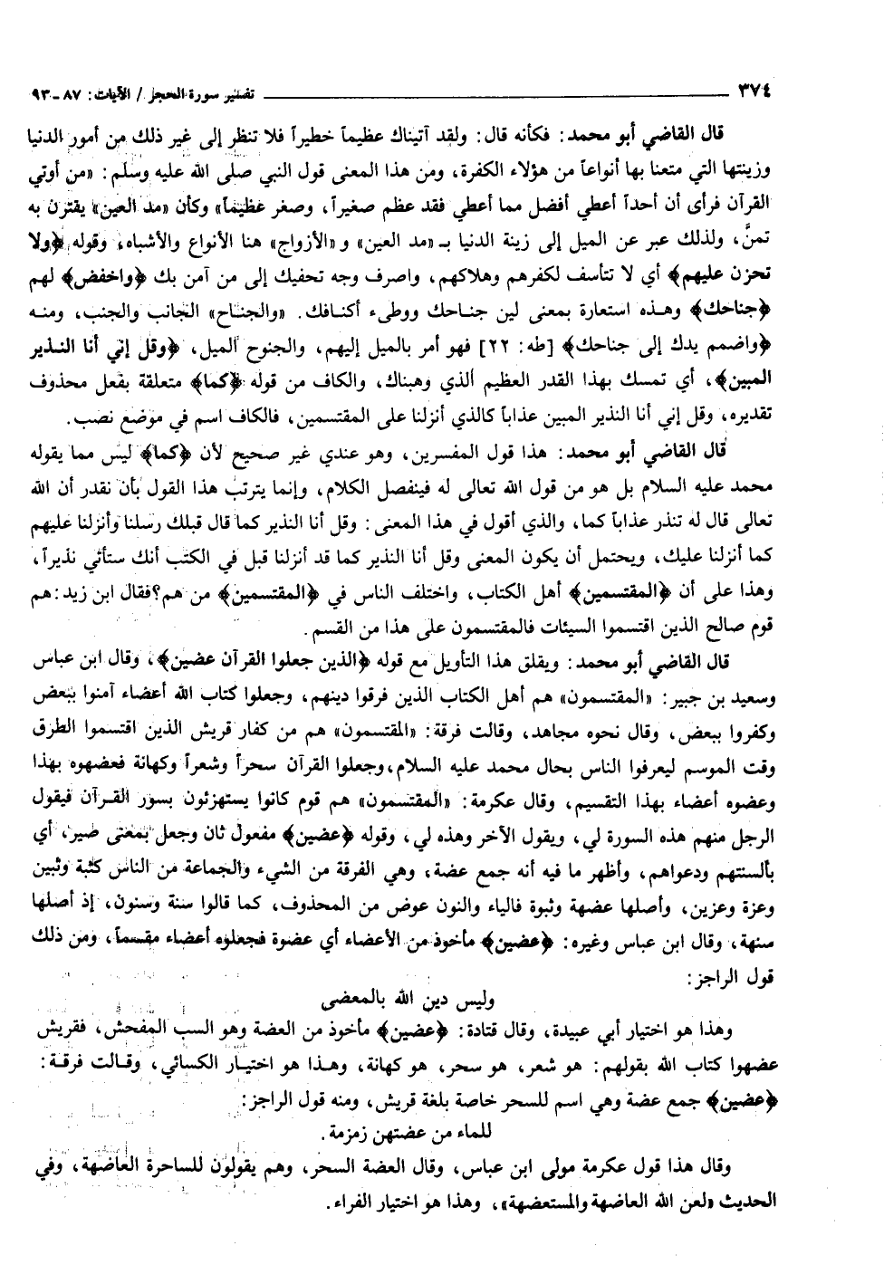 قال القاضي أبو محمد: ويقلق هذا التأويل مع قوله الَّذِينَ جَعَلُوا الْقُرْآنَ عِضِينَ، وقال ابن عباس وسعيد بن جبير: «المقتسمون» هم أهل الكتاب الذين فرقوا دينهم، وجعلوا كتاب الله أعضاء آمنوا ببعض وكفروا ببعض، وقال نحوه مجاهد، وقالت فرقة: «المقتسمون» هم من كفار قريش الذين اقتسموا الطرق وقت الموسم ليعرفوا الناس بحال محمد عليه السلام، وجعلوا القرآن سحرا وشعرا وكهانة فعضهوه بهذا وعضوه أعضاء بهذا التقسيم، وقال عكرمة: «المقتسمون» هم قوم كانوا يستهزئون بسور القرآن فيقول الرجل منهم هذه السورة لي، ويقول الآخر وهذه لي، وقوله عِضِينَ مفعول ثان وجعل بمعنى صير، أي بألسنتهم ودعواهم، وأظهر ما فيه أنه جمع عضة، وهي الفرقة من الشيء والجماعة من الناس كثبة وثبين وعزة وعزين، وأصلها عضهة وثبوة فالياء والنون عوض من المحذوف، كما قالوا سنة وسنون، إذ أصلها سنهة، وقال ابن عباس وغيره: عِضِينَ مأخوذ من الأعضاء أي عضوة فجعلوه أعضاء مقسما، ومن ذلك قول الراجز: