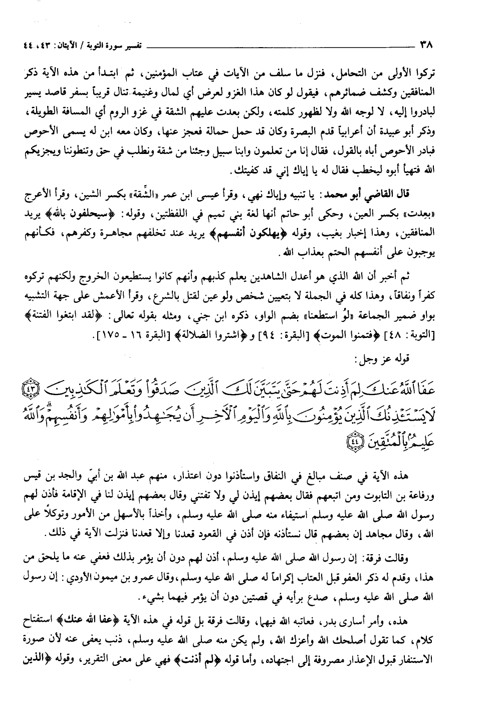 عَفَا اللَّهُ عَنْكَ لِمَ أَذِنْتَ لَهُمْ حَتَّى يَتَبَيَّنَ لَكَ الَّذِينَ صَدَقُوا وَتَعْلَمَ الْكاذِبِينَ (٤٣) لا يَسْتَأْذِنُكَ الَّذِينَ يُؤْمِنُونَ بِاللَّهِ وَالْيَوْمِ الْآخِرِ أَنْ يُجاهِدُوا بِأَمْوالِهِمْ وَأَنْفُسِهِمْ وَاللَّهُ عَلِيمٌ بِالْمُتَّقِينَ (٤٤)