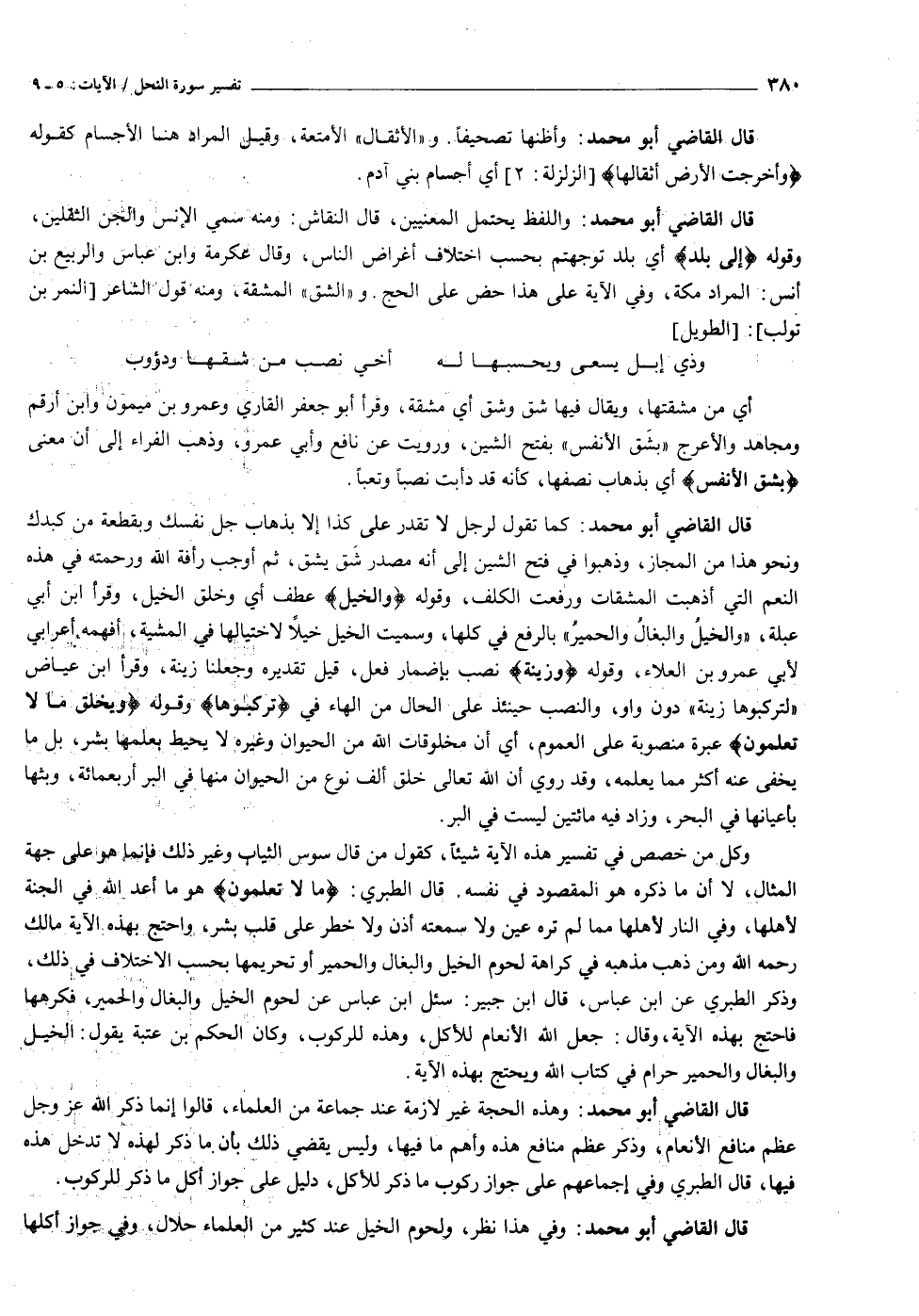وكل من خصص في تفسير هذه الآية شيئا، كقول من قال سوس الثياب وغير ذلك فإنما هو على جهة المثال، لا أن ما ذكره هو المقصود في نفسه. قال الطبري: ما لا تَعْلَمُونَ هو ما أعد الله في الجنة لأهلها، وفي النار لأهلها مما لم تره عين ولا سمعته أذن ولا خطر على قلب بشر، واحتج بهذه الآية مالك رحمه الله ومن ذهب مذهبه في كراهة لحوم الخيل والبغال والحمير أو تحريمها بحسب الاختلاف في ذلك، وذكر الطبري عن ابن عباس، قال ابن جبير: سئل ابن عباس عن لحوم الخيل والبغال والحمير، فكرهها فاحتج بهذه الآية، وقال: جعل الله الأنعام للأكل، وهذه للركوب، وكان الحكم بن عتبة يقول: الخيل والبغال والحمير حرام في كتاب الله ويحتج بهذه الآية.
