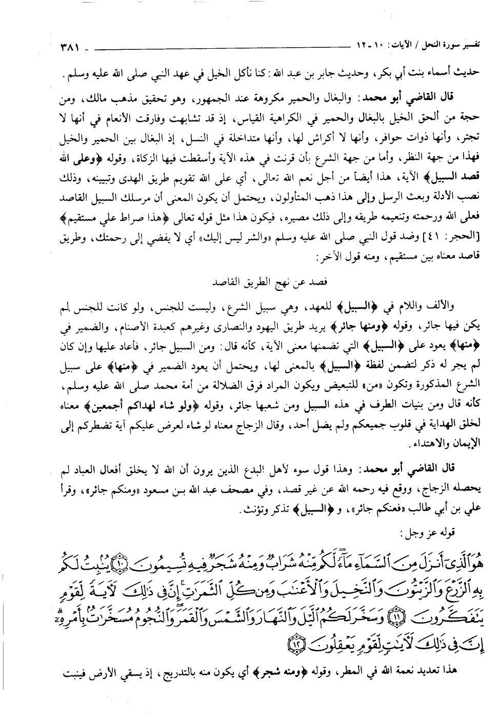 قال القاضي أبو محمد: والبغال والحمير مكروهة عند الجمهور، وهو تحقيق مذهب مالك، ومن حجة من ألحق الخيل بالبغال والحمير في الكراهية القياس، إذ قد تشابهت وفارقت الأنعام في أنها لا تجتر، وأنها ذوات حوافر، وأنها لا أكراش لها، وأنها متداخلة في النسل، إذ البغال بين الحمير والخيل فهذا من جهة النظر، وأما من جهة الشرع بأن قرنت في هذه الآية وأسقطت فيها الزكاة، وقوله وَعَلَى اللَّهِ قَصْدُ السَّبِيلِ الآية، هذا أيضا من أجل نعم الله تعالى، أي على الله تقويم طريق الهدى وتبيينه، وذلك نصب الأدلة وبعث الرسل وإلى هذا ذهب المتأولون، ويحتمل أن يكون المعنى أن مرسلك السبيل القاصد فعلى الله ورحمته وتنعيمه طريقه وإلى ذلك مصيره، فيكون هذا مثل قوله تعالى هذا صِراطٌ عَلَيَّ مُسْتَقِيمٌ [الحجر: ٤١] وضد قول النبي صلى الله عليه وسلم «والشر ليس إليك» أي لا يفضي إلى رحمتك، وطريق قاصد معناه بين مستقيم، ومنه قول الآخر: