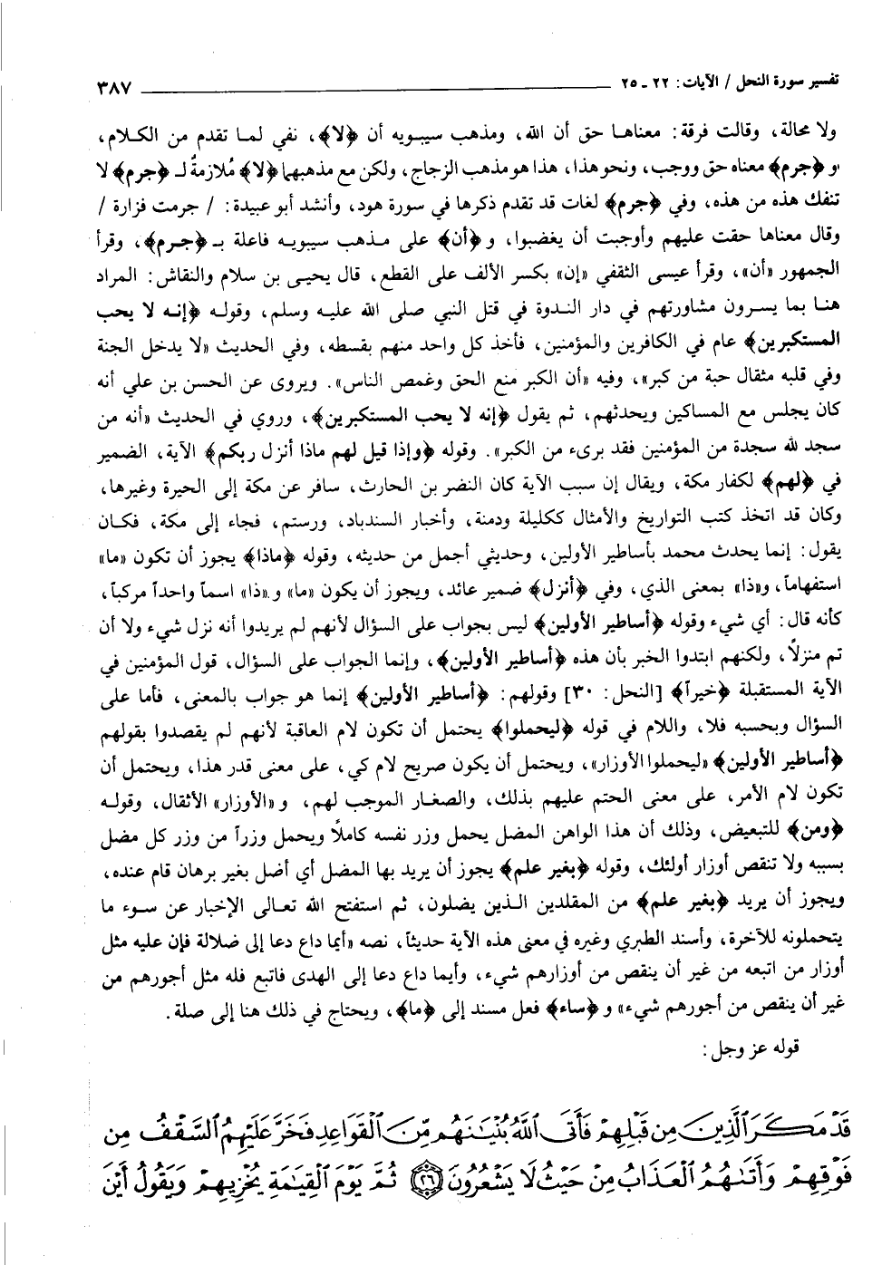 ولا محالة، وقالت فرقة: معناها حق أن الله، ومذهب سيبويه أن لا، نفي لما تقدم من الكلام، وجَرَمَ معناه حق ووجب، ونحو هذا، هذا هو مذهب الزجاج، ولكن مع مذهبهما لا ملازمة ل جَرَمَ لا تنفك هذه من هذه، وفي جَرَمَ لغات قد تقدم ذكرها في سورة هود، وأنشد أبو عبيدة: / جرمت فزارة/ وقال معناها حقت عليهم وأوجبت أن يغضبوا، وأَنَّ على مذهب سيبويه فاعلة ب جَرَمَ، وقرأ الجمهور «أن» ، وقرأ عيسى الثقفي «إن» بكسر الألف على القطع، قال يحيى بن سلام والنقاش: المراد هنا بما يسرون مشاورتهم في دار الندوة في قتل النبي صلى الله عليه وسلم، وقوله إِنَّهُ لا يُحِبُّ الْمُسْتَكْبِرِينَ عام في الكافرين والمؤمنين، فأخذ كل واحد منهم بقسطه، وفي الحديث «لا يدخل الجنة وفي قلبه مثقال حبة من كبر» ، وفيه «أن الكبر منع الحق وغمص الناس» . ويروى عن الحسن بن علي أنه كان يجلس مع المساكين ويحدثهم، ثم يقول إِنَّهُ لا يُحِبُّ الْمُسْتَكْبِرِينَ، وروي في الحديث «أنه من سجد لله سجدة من المؤمنين فقد برىء من الكبر» . وقوله وَإِذا قِيلَ لَهُمْ ماذا أَنْزَلَ رَبُّكُمْ الآية، الضمير في لَهُمْ لكفار مكة، ويقال إن سبب الآية كان النضر بن الحارث، سافر عن مكة إلى الحيرة وغيرها، وكان قد اتخذ كتب التواريخ والأمثال ككليلة ودمنة، وأخبار السندباد، ورستم، فجاء إلى مكة، فكان يقول: إنما يحدث محمد بأساطير الأولين، وحديثي أجمل من حديثه، وقوله ماذا يجوز أن تكون «ما» استفهاما، و «ذا» بمعنى الذي، وفي أَنْزَلَ ضمير عائد، ويجوز أن يكون «ما» و «ذا» اسما واحدا مركبا، كأنه قال: أي شيء وقوله أَساطِيرُ الْأَوَّلِينَ ليس بجواب على السؤال لأنهم لم يريدوا أنه نزل شيء ولا أن تم منزلا، ولكنهم ابتدوا الخبر بأن هذه أَساطِيرُ الْأَوَّلِينَ، وإنما الجواب على السؤال، قول المؤمنين في الآية المستقبلة خَيْراً [النحل: ٣٠] وقولهم: أَساطِيرُ الْأَوَّلِينَ إنما هو جواب بالمعنى، فأما على السؤال وبحسبه فلا، واللام في قوله لِيَحْمِلُوا يحتمل أن تكون لام العاقبة لأنهم لم يقصدوا بقولهم أَساطِيرُ الْأَوَّلِينَ «ليحملوا الأوزار» ، ويحتمل أن يكون صريح لام كي، على معنى قدر هذا، ويحتمل أن تكون لام الأمر، على معنى الحتم عليهم بذلك، والصغار الموجب لهم، و «الأوزار» الأثقال، وقوله وَمِنْ للتبعيض، وذلك أن هذا الواهن المضل يحمل وزر نفسه كاملا ويحمل وزرا من وزر كل مضل بسببه ولا تنقص أوزار أولئك، وقوله بِغَيْرِ عِلْمٍ يجوز أن يريد بها المضل أي أضل بغير برهان قام عنده، ويجوز أن يريد بِغَيْرِ عِلْمٍ من المقلدين الذين يضلون، ثم استفتح الله تعالى الإخبار عن سوء ما يتحملونه للآخرة، وأسند الطبري وغيره في معنى هذه الآية حديثا، نصه «أيما داع دعا إلى ضلالة فإن عليه مثل أوزار من اتبعه من غير أن ينقص من أوزارهم شيء، وأيما داع دعا إلى الهدى فاتبع فله مثل أجورهم من غير أن ينقص من أجورهم شيء» وساءَ فعل مسند إلى ما، ويحتاج في ذلك هنا إلى صلة.