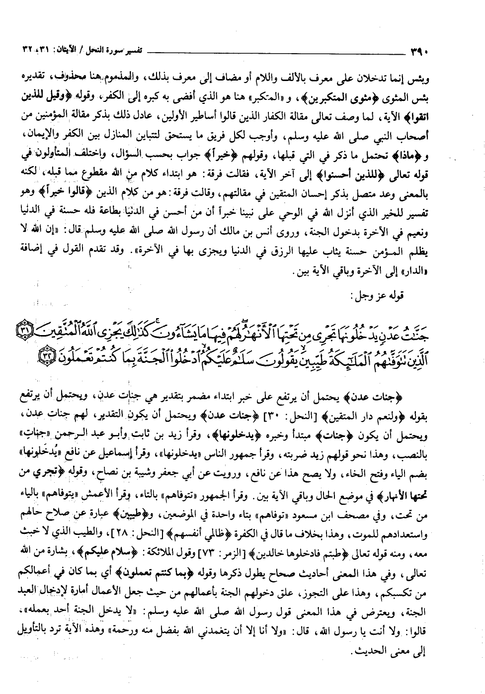 جَنَّاتُ عَدْنٍ يَدْخُلُونَها تَجْرِي مِنْ تَحْتِهَا الْأَنْهارُ لَهُمْ فِيها ما يَشاؤُنَ كَذلِكَ يَجْزِي اللَّهُ الْمُتَّقِينَ (٣١) الَّذِينَ تَتَوَفَّاهُمُ الْمَلائِكَةُ طَيِّبِينَ يَقُولُونَ سَلامٌ عَلَيْكُمْ ادْخُلُوا الْجَنَّةَ بِما كُنْتُمْ تَعْمَلُونَ (٣٢)