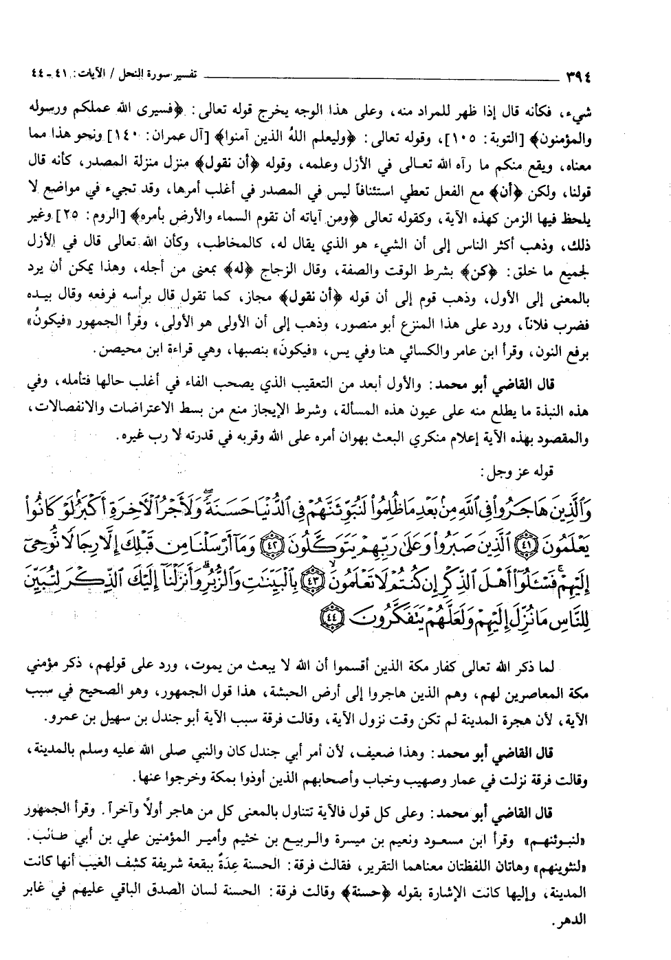 وَالَّذِينَ هاجَرُوا فِي اللَّهِ مِنْ بَعْدِ ما ظُلِمُوا لَنُبَوِّئَنَّهُمْ فِي الدُّنْيا حَسَنَةً وَلَأَجْرُ الْآخِرَةِ أَكْبَرُ لَوْ كانُوا يَعْلَمُونَ (٤١) الَّذِينَ صَبَرُوا وَعَلى رَبِّهِمْ يَتَوَكَّلُونَ (٤٢) وَما أَرْسَلْنا مِنْ قَبْلِكَ إِلاَّ رِجالاً نُوحِي إِلَيْهِمْ فَسْئَلُوا أَهْلَ الذِّكْرِ إِنْ كُنْتُمْ لا تَعْلَمُونَ (٤٣) بِالْبَيِّناتِ وَالزُّبُرِ وَأَنْزَلْنا إِلَيْكَ الذِّكْرَ لِتُبَيِّنَ لِلنَّاسِ ما نُزِّلَ إِلَيْهِمْ وَلَعَلَّهُمْ يَتَفَكَّرُونَ (٤٤)