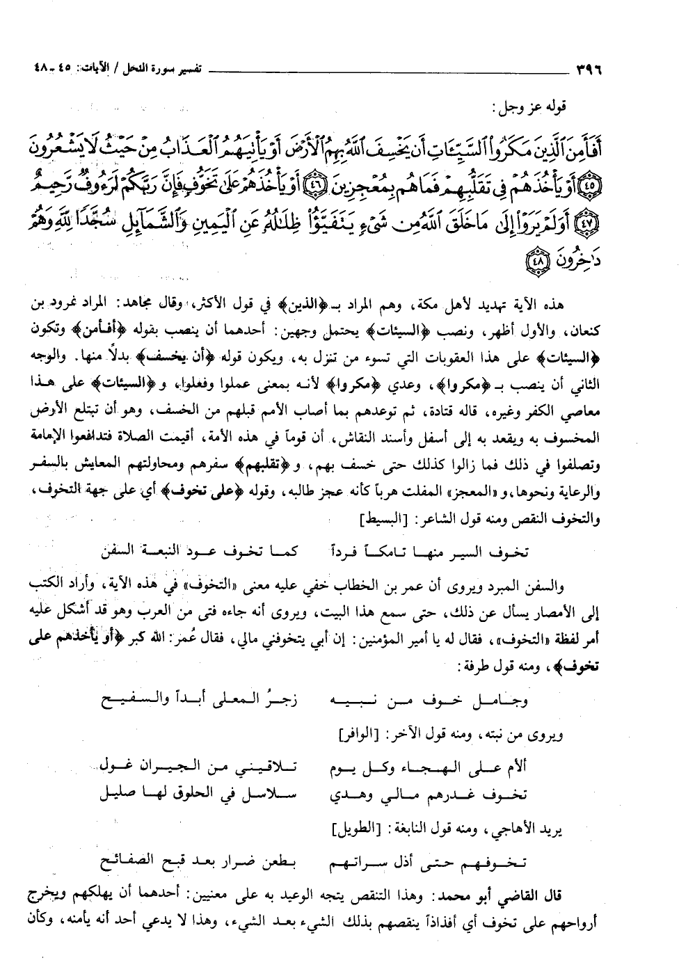 والسفن المبرد ويروى أن عمر بن الخطاب خفي عليه معنى «التخوف» في هذه الآية، وأراد الكتب إلى الأمصار يسأل عن ذلك، حتى سمع هذا البيت، ويروى أنه جاءه فتى من العرب وهو قد أشكل عليه أمر لفظة «التخوف» ، فقال له يا أمير المؤمنين: إن أبي يتخوفني مالي، فقال عمر: الله اكبر أَوْ يَأْخُذَهُمْ عَلى تَخَوُّفٍ، ومنه قول طرفة: