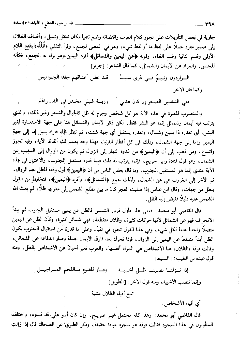 والمنصوب للعبرة في هذه الآية هو كل شخص وجرم له ظل كالجبال والشجر وغير ذلك، والذي يترتب فيه أيمان وشمائل إنما هو البشر فقط، لكن ذكر الأيمان والشمائل هنا على جهة الاستعارة لغير البشر، أي تقدره ذا يمين وشمال، وتقدره يستقبل أي جهة شئت، ثم تنظر ظله فتراه يميل إما إلى جهة اليمين وإما إلى جهة الشمال، وذلك في كل أقطار الدنيا، فهذا وجه يعمم لك ألفاظ الآية، وفيه تجوز واتساع، ومن ذهب إلى أن الْيَمِينِ من غدوة النهار إلى الزوال ثم يكون من الزوال إلى المغيب عن الشمال، وهو قول قتادة وابن جريج، فإنما يترتب له ذلك فيما قدره مستقبل الجنوب، والاعتبار في هذه الآية عندي إنما هو المستقبل الجنوب، وما قال بعض الناس من أن الْيَمِينِ أول وقعة للظل بعد الزوال، ثم الآخر إلى الغروب هي عن الشمال، ولذلك جمع الشَّمائِلِ، وأفرد الْيَمِينِ، فتخليط من القول يبطل من جهات، وقال ابن عباس إذا صليت الفجر كان ما بين مطلع الشمس إلى مغربها ظلا، ثم بعث الله الشمس عليه دليلا فقبض إليه الظل.