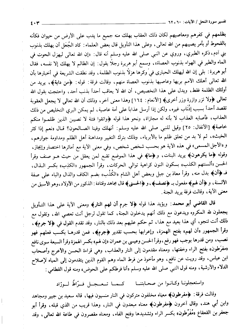 قال القاضي أبو محمد: ويؤيد هذا قوله لا جَرَمَ أَنَّ لَهُمُ النَّارَ ومعنى الآية على هذا التأويل يجعلون لله المكروه ويدعون مع ذلك أنهم يدخلون الجنة، كما تقول لرجل أنت تعصي الله، وتقول مع ذلك أنت تنجو، أي هذا بعيد مع هذا، ثم حكم عليهم بعد ذلك بالنار، وقد تقدم القول في لا جَرَمَ، وقرأ الجمهور «أن لهم» بفتح الهمزة، وإعرابها بحسب تقدير جَرَمَ، فمن قدرها بكسب فعلهم فهو نصب، ومن قدرها يوجب فهو رفع، وقرأ الحسن وعيسى بن عمران «إن لهم» بكسر الهمزة وقرأ السبعة سوى نافع «مفرطون» بفتح الراء وخفتها، ومعناه مقدمون إلى النار والعذاب، وهي قراءة الحسن والأعرج وأصحاب ابن عباس، وقد رويت عن نافع، وهو مأخوذ من فرط الماء وهم القوم الذين يتقدمون إلى المياه لإصلاح الدلاء والأرشية، ومنه قول النبي صلى الله عليه وسلم «أنا فرطكم على الحوض» ومنه قول القطامي: