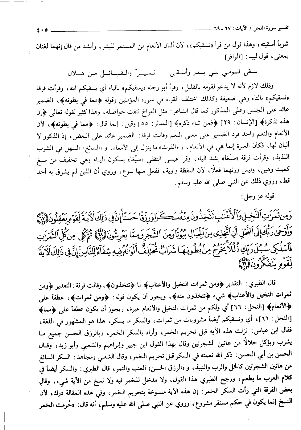 وَمِنْ ثَمَراتِ النَّخِيلِ وَالْأَعْنابِ تَتَّخِذُونَ مِنْهُ سَكَراً وَرِزْقاً حَسَناً إِنَّ فِي ذلِكَ لَآيَةً لِقَوْمٍ يَعْقِلُونَ (٦٧) وَأَوْحى رَبُّكَ إِلَى النَّحْلِ أَنِ اتَّخِذِي مِنَ الْجِبالِ بُيُوتاً وَمِنَ الشَّجَرِ وَمِمَّا يَعْرِشُونَ (٦٨) ثُمَّ كُلِي مِنْ كُلِّ الثَّمَراتِ فَاسْلُكِي سُبُلَ رَبِّكِ ذُلُلاً يَخْرُجُ مِنْ بُطُونِها شَرابٌ مُخْتَلِفٌ أَلْوانُهُ فِيهِ شِفاءٌ لِلنَّاسِ إِنَّ فِي ذلِكَ لَآيَةً لِقَوْمٍ يَتَفَكَّرُونَ (٦٩)