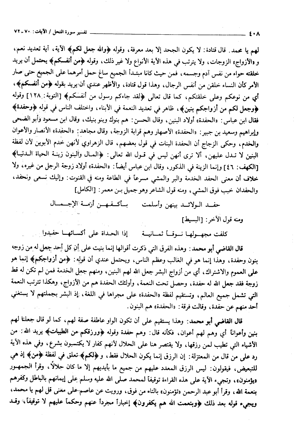 لهم يا محمد. قال قتادة: لا يكون الجحد إلا بعد معرفة، وقوله وَاللَّهُ جَعَلَ لَكُمْ الآية، آية تعديد نعم، و «الأزواج» الزوجات، ولا يترتب في هذه الآية الأنواع ولا غير ذلك، وقوله مِنْ أَنْفُسِكُمْ يحتمل أن يريد خلقته حواء من نفس آدم وجسمه، فمن حيث كانا مبتدأ الجميع ساغ حمل أمرهما على الجميع حتى صار الأمر كأن النساء خلقن من أنفس الرجال، وهذا قول قتادة، والأظهر عندي أن يريد بقوله مِنْ أَنْفُسِكُمْ، أي من نوعكم وعلى خلقتكم، كما قال تعالى لَقَدْ جاءَكُمْ رَسُولٌ مِنْ أَنْفُسِكُمْ [التوبة: ١٢٨] وقوله وَجَعَلَ لَكُمْ مِنْ أَزْواجِكُمْ بَنِينَ، ظاهر في تعديد النعمة في الأبناء، واختلف الناس في قوله وَحَفَدَةً فقال ابن عباس: «الحفدة» أولاد البنين، وقال الحسن: هم بنوك وبنو بنيك، وقال ابن مسعود وأبو الضحى وإبراهيم وسعيد بن جبير: «الحفدة» الأصهار وهم قرابة الزوجة، وقال مجاهد: «الحفدة» الأنصار والأعوان والخدم، وحكى الزجاج أن الحفدة البنات في قول بعضهم، قال الزهراوي لأنهن خدم الأبوين لأن لفظة البنين لا تدل عليهن، ألا ترى أنهن ليس في قول الله تعالى: الْمالُ وَالْبَنُونَ زِينَةُ الْحَياةِ الدُّنْيا [الكهف: ٤٦] وإنما الزينة في الذكور، وقال ابن عباس أيضا: «الحفدة» أولاد زوجة الرجل من غيره، ولا خلاف أن معنى الحفد الخدمة والبر والمشي مسرعا في الطاعة ومنه في القنوت: وإليك نسعى ونحفد، والحفدان خبب فوق المشي، ومنه قول الشاعر وهو جميل بن معمر: [الكامل]