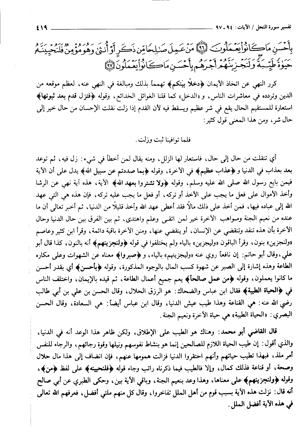 قال القاضي أبو محمد: وهناك هو الطيب على الإطلاق، ولكن ظاهر هذا الوعد أنه في الدنيا، والذي أقول: إن طيب الحياة اللازم للصالحين إنما هو بنشاط نفوسهم ونيلها وقوة رجائهم، والرجاء للنفس أمر ملذ، فبهذا تطيب حياتهم وأنهم احتقروا الدنيا فزالت همومها عنهم، فإن انضاف إلى هذا مال حلال وصحة، أو قناعة فذلك كمال، وإلا فالطيب فيما ذكرناه راتب وجاء قوله فَلَنُحْيِيَنَّهُ على لفظ مَنْ، وقوله وَلَنَجْزِيَنَّهُمْ على معناها، وهذا وعد بنعيم الجنة، وباقي الآية بين، وحكى الطبري عن أبي صالح أنه قال: نزلت هذه الآية بسبب قوم من أهل الملل تفاخروا، وقال كل منهم ملتي أفضل، فعرفهم الله تعالى في هذه الآية أفضل الملل.