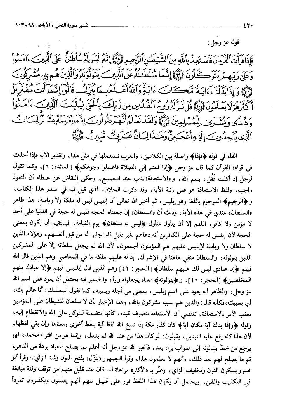 فَإِذا قَرَأْتَ الْقُرْآنَ فَاسْتَعِذْ بِاللَّهِ مِنَ الشَّيْطانِ الرَّجِيمِ (٩٨) إِنَّهُ لَيْسَ لَهُ سُلْطانٌ عَلَى الَّذِينَ آمَنُوا وَعَلى رَبِّهِمْ يَتَوَكَّلُونَ (٩٩) إِنَّما سُلْطانُهُ عَلَى الَّذِينَ يَتَوَلَّوْنَهُ وَالَّذِينَ هُمْ بِهِ مُشْرِكُونَ (١٠٠) وَإِذا بَدَّلْنا آيَةً مَكانَ آيَةٍ وَاللَّهُ أَعْلَمُ بِما يُنَزِّلُ قالُوا إِنَّما أَنْتَ مُفْتَرٍ بَلْ أَكْثَرُهُمْ لا يَعْلَمُونَ (١٠١) قُلْ نَزَّلَهُ رُوحُ الْقُدُسِ مِنْ رَبِّكَ بِالْحَقِّ لِيُثَبِّتَ الَّذِينَ آمَنُوا وَهُدىً وَبُشْرى لِلْمُسْلِمِينَ (١٠٢)