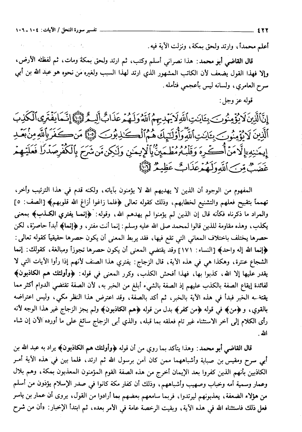 إِنَّ الَّذِينَ لا يُؤْمِنُونَ بِآياتِ اللَّهِ لا يَهْدِيهِمُ اللَّهُ وَلَهُمْ عَذابٌ أَلِيمٌ (١٠٤) إِنَّما يَفْتَرِي الْكَذِبَ الَّذِينَ لا يُؤْمِنُونَ بِآياتِ اللَّهِ وَأُولئِكَ هُمُ الْكاذِبُونَ (١٠٥) مَنْ كَفَرَ بِاللَّهِ مِنْ بَعْدِ إِيمانِهِ إِلاَّ مَنْ أُكْرِهَ وَقَلْبُهُ مُطْمَئِنٌّ بِالْإِيمانِ وَلكِنْ مَنْ شَرَحَ بِالْكُفْرِ صَدْراً فَعَلَيْهِمْ غَضَبٌ مِنَ اللَّهِ وَلَهُمْ عَذابٌ عَظِيمٌ (١٠٦)