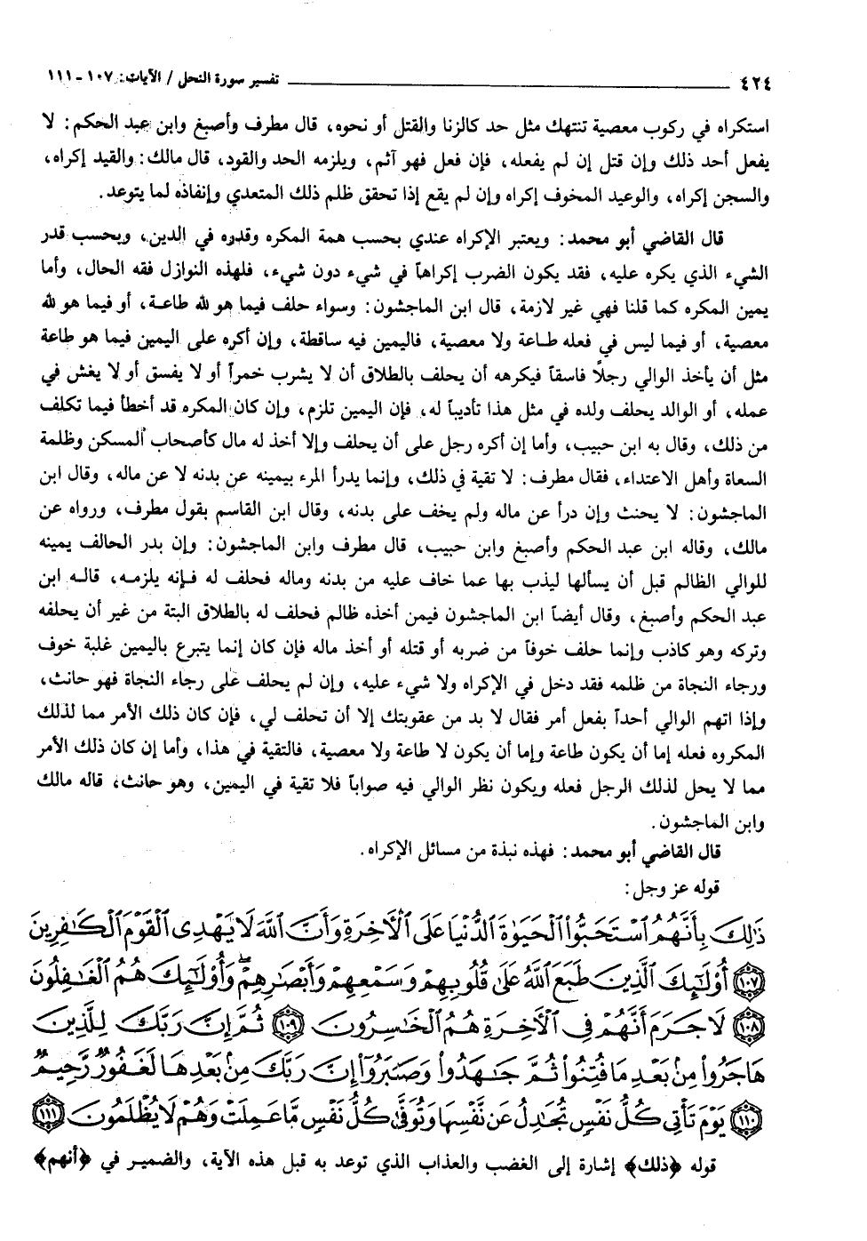 ذلِكَ بِأَنَّهُمُ اسْتَحَبُّوا الْحَياةَ الدُّنْيا عَلَى الْآخِرَةِ وَأَنَّ اللَّهَ لا يَهْدِي الْقَوْمَ الْكافِرِينَ (١٠٧) أُولئِكَ الَّذِينَ طَبَعَ اللَّهُ عَلى قُلُوبِهِمْ وَسَمْعِهِمْ وَأَبْصارِهِمْ وَأُولئِكَ هُمُ الْغافِلُونَ (١٠٨) لا جَرَمَ أَنَّهُمْ فِي الْآخِرَةِ هُمُ الْخاسِرُونَ (١٠٩) ثُمَّ إِنَّ رَبَّكَ لِلَّذِينَ هاجَرُوا مِنْ بَعْدِ ما فُتِنُوا ثُمَّ جاهَدُوا وَصَبَرُوا إِنَّ رَبَّكَ مِنْ بَعْدِها لَغَفُورٌ رَحِيمٌ (١١٠) يَوْمَ تَأْتِي كُلُّ نَفْسٍ تُجادِلُ عَنْ نَفْسِها وَتُوَفَّى كُلُّ نَفْسٍ ما عَمِلَتْ وَهُمْ لا يُظْلَمُونَ (١١١)