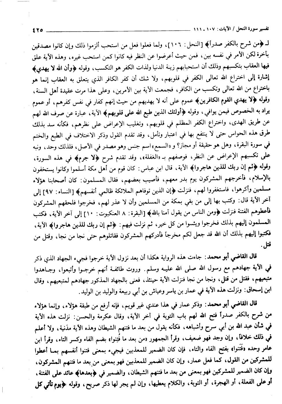 ل مَنْ شَرَحَ بِالْكُفْرِ صَدْراً [النحل: ١٠٦] ، ولما فعلوا فعل من استحب ألزموا ذلك وإن كانوا مصدقين بآخرة لكن الأمر في نفسه بين، فمن حيث أعرضوا عن النظر فيه كانوا كمن استحب غيره، وهذه الآية علق فيها العقاب بتكسبهم وذلك أن استحبابهم زينة الدنيا ولذات الكفر هو التكسب، وقوله وَأَنَّ اللَّهَ لا يَهْدِي إشارة إلى اختراع الله تعالى الكفر في قلوبهم، ولا شك أن كفر الكافر الذي يتعلق به العقاب إنما هو باختراع من الله تعالى وتكسب من الكافر، فجمعت الآية بين الأمرين، وعلى هذا مرت عقيدة أهل السنة، وقوله لا يَهْدِي الْقَوْمَ الْكافِرِينَ عموم على أنه لا يهديهم من حيث إنهم كفار في نفس كفرهم، أو عموم يراد به الخصوص فيمن يوافي، وقوله أُولئِكَ الَّذِينَ طَبَعَ اللَّهُ عَلى قُلُوبِهِمْ الآية، عبارة عن صرف الله لهم عن طريق الهدى، واختراع الكفر المظلم في قلوبهم، وتغليب الإعراض على نظرهم، فكأنه سد بذلك طرق هذه الحواس حتى لا ينتفع بها في اعتبار وتأمل، وقد تقدم القول وذكر الاختلاف في الطبع والختم في سورة البقرة، وهل هو حقيقة أو مجاز؟ و «السمع» اسم جنس وهو مصدر في الأصل، فلذلك وحد، ونبه على تكسبهم الإعراض عن النظر، فوصفهم ب «الغفلة» ، وقد تقدم شرح لا جَرَمَ في هذه السورة، وقوله ثُمَّ إِنَّ رَبَّكَ لِلَّذِينَ هاجَرُوا الآية، قال ابن عباس: كان قوم من أهل مكة أسلموا وكانوا يستخفون بالإسلام، فأخرجهم المشركون يوم بدر معهم، فأصيب بعضهم، فقال المسلمون: كان أصحابنا هؤلاء مسلمين وأكرهوا، فاستغفروا لهم، فنزلت إِنَّ الَّذِينَ تَوَفَّاهُمُ الْمَلائِكَةُ ظالِمِي أَنْفُسِهِمْ [النساء: ٩٧] إلى آخر الآية قال: وكتب بها إلى من بقي بمكة من المسلمين وأن لا عذر لهم، فخرجوا فلحقهم المشركون فأعطوهم الفتنة فنزلت وَمِنَ النَّاسِ مَنْ يَقُولُ آمَنَّا بِاللَّهِ [البقرة: ٨ العنكبوت: ١٠] إلى آخر الآية، فكتب المسلمون إليهم بذلك فخرجوا ويئسوا من كل خير، ثم نزلت فيهم: ثُمَّ إِنَّ رَبَّكَ لِلَّذِينَ هاجَرُوا الآية، فكتبوا إليهم بذلك أن الله قد جعل لكم مخرجا فأدركهم المشركون فقاتلوهم حتى نجا من نجا، وقتل من قتل.