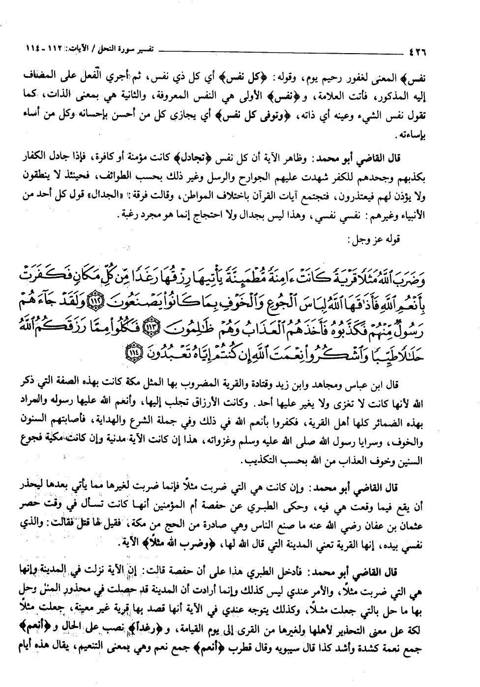 وَضَرَبَ اللَّهُ مَثَلاً قَرْيَةً كانَتْ آمِنَةً مُطْمَئِنَّةً يَأْتِيها رِزْقُها رَغَداً مِنْ كُلِّ مَكانٍ فَكَفَرَتْ بِأَنْعُمِ اللَّهِ فَأَذاقَهَا اللَّهُ لِباسَ الْجُوعِ وَالْخَوْفِ بِما كانُوا يَصْنَعُونَ (١١٢) وَلَقَدْ جاءَهُمْ رَسُولٌ مِنْهُمْ فَكَذَّبُوهُ فَأَخَذَهُمُ الْعَذابُ وَهُمْ ظالِمُونَ (١١٣) فَكُلُوا مِمَّا رَزَقَكُمُ اللَّهُ حَلالاً طَيِّباً وَاشْكُرُوا نِعْمَتَ اللَّهِ إِنْ كُنْتُمْ إِيَّاهُ تَعْبُدُونَ (١١٤)
