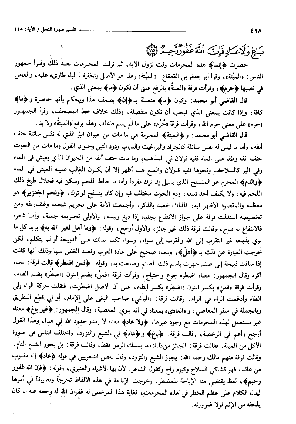 قال القاضي أبو محمد: والْمَيْتَةَ المحرمة هي ما مات من حيوان البر الذي له نفس سائلة حتف أنفه، وأما ما ليس له نفس سائلة كالجراد والبراغيث والذباب ودود التين وحيوان الفول وما مات من الحوت حتف أنفه وطفا على الماء ففيه قولان في المذهب، وما مات حتف أنفه من الحيوان الذي يعيش في الماء وفي البر كالسلاحف ونحوها ففيه قولان والمنع هنا أظهر إلا أن يكون الغالب عليه العيش في الماء وَالدَّمَ المحرم هو المنسفح الذي يسيل إن ترك مفردا وأما ما خالط اللحم وسكن فيه فحلال طبخ ذلك اللحم فيه، ولا يكلف أحد تتبعه، ودم الحوت مختلف فيه وإن كان ينسفح لو ترك، وَلَحْمَ الْخِنْزِيرِ هو معظمه والمقصود الأظهر فيه، فلذلك خصه بالذكر، وأجمعت الأمة على تحريم شحمه وغضاريفه ومن تخصيصه استدلت فرقة على جواز الانتفاع بجلده إذا دبغ ولبسه، والأولى تحريمه جملة، وأما شعره فالانتفاع به مباح، وقالت فرقة ذلك غير جائز، والأول أرجح، وقوله: وَما أُهِلَّ لِغَيْرِ اللَّهِ بِهِ يريد كل ما نوي بذبحه غير التقرب إلى الله والقرب إلى سواء، وسواء تكلم بذلك على الذبيحة أو لم يتكلم، لكن خرجت العبارة عن ذلك ب أُهِلَّ، ومعناه صحيح على عادة العرب وقصد الغض منها وذلك أنها كانت إذا ساقت ذبيحة إلى صنم جهرت باسم ذلك الصنم وصاحت به، وقوله: فَمَنِ اضْطُرَّ قالت فرقة: معناه أكره وقال الجمهور: معناه اضطره جوع واحتياج، وقرأت فرقة «فمن» بضم النون «اضطر» بضم الطاء، وقرأت فرقة «فمن» بكسر النون «اضطر» بكسر الطاء، على أن الأصل اضطرت، فنقلت حركة الراء إلى الطاء وأدغمت الراء في الراء، وقالت فرقة: «الباغي» صاحب البغي على الإمام، أو في قطع الطريق وبالجملة في سفر المعاصي، و «العادي» بمعناه في أنه ينوي المعصية، وقال الجمهور: غَيْرَ باغٍ معناه غير مستعمل لهذه المحرمات مع وجود غيرها، وَلا عادٍ معناه لا يعدو حدود الله في هذا، وهذا القول أرجح وأعم في الرخصة، وقالت فرقة: باغٍ وعادٍ في الشبع والتزود، واختلف الناس في صورة الأكل من الميتة، فقالت فرقة: الجائز من ذلك ما يمسك الرمق فقط، وقالت فرقة: بل يجوز الشبع التام، وقالت فرقة منهم مالك رحمه الله: يجوز الشبع والتزود، وقال بعض النحويين في قوله عادٍ إنه مقلوب من عائد، فهو كشاكي السلاح وكيوم راح وكقول الشاعر: لأن بها الأشياء والعنبري، وقوله: فَإِنَّ اللَّهَ غَفُورٌ رَحِيمٌ، لفظ يقتضي منه الإباحة للمضطر، وخرجت الإباحة في هذه الألفاظ تحرجا وتضييقا في أمرها ليدل الكلام على عظم الخطر في هذه المحرمات، فغاية هذا المرخص له غفران الله له وحطه عنه ما كان يلحقه من الإثم لولا ضرورته.