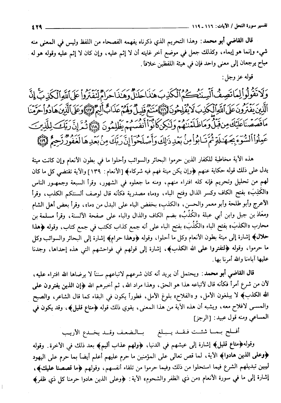 وَلا تَقُولُوا لِما تَصِفُ أَلْسِنَتُكُمُ الْكَذِبَ هذا حَلالٌ وَهذا حَرامٌ لِتَفْتَرُوا عَلَى اللَّهِ الْكَذِبَ إِنَّ الَّذِينَ يَفْتَرُونَ عَلَى اللَّهِ الْكَذِبَ لا يُفْلِحُونَ (١١٦) مَتاعٌ قَلِيلٌ وَلَهُمْ عَذابٌ أَلِيمٌ (١١٧) وَعَلَى الَّذِينَ هادُوا حَرَّمْنا ما قَصَصْنا عَلَيْكَ مِنْ قَبْلُ وَما ظَلَمْناهُمْ وَلكِنْ كانُوا أَنْفُسَهُمْ يَظْلِمُونَ (١١٨) ثُمَّ إِنَّ رَبَّكَ لِلَّذِينَ عَمِلُوا السُّوءَ بِجَهالَةٍ ثُمَّ تابُوا مِنْ بَعْدِ ذلِكَ وَأَصْلَحُوا إِنَّ رَبَّكَ مِنْ بَعْدِها لَغَفُورٌ رَحِيمٌ (١١٩)