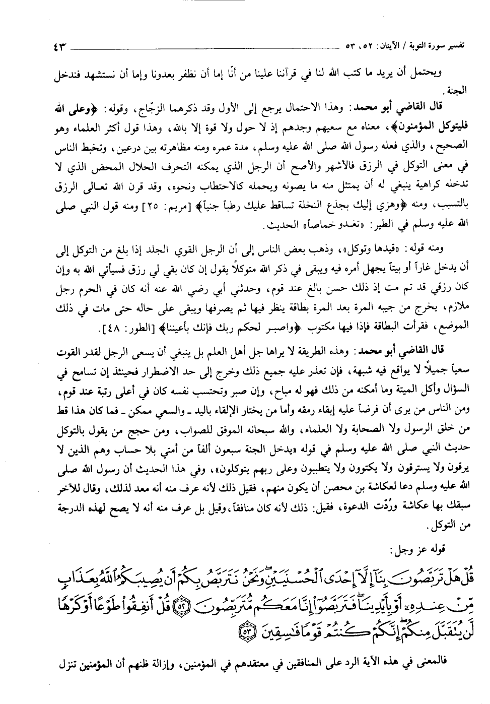 قُلْ هَلْ تَرَبَّصُونَ بِنا إِلاَّ إِحْدَى الْحُسْنَيَيْنِ وَنَحْنُ نَتَرَبَّصُ بِكُمْ أَنْ يُصِيبَكُمُ اللَّهُ بِعَذابٍ مِنْ عِنْدِهِ أَوْ بِأَيْدِينا فَتَرَبَّصُوا إِنَّا مَعَكُمْ مُتَرَبِّصُونَ (٥٢) قُلْ أَنْفِقُوا طَوْعاً أَوْ كَرْهاً لَنْ يُتَقَبَّلَ مِنْكُمْ إِنَّكُمْ كُنْتُمْ قَوْماً فاسِقِينَ (٥٣)