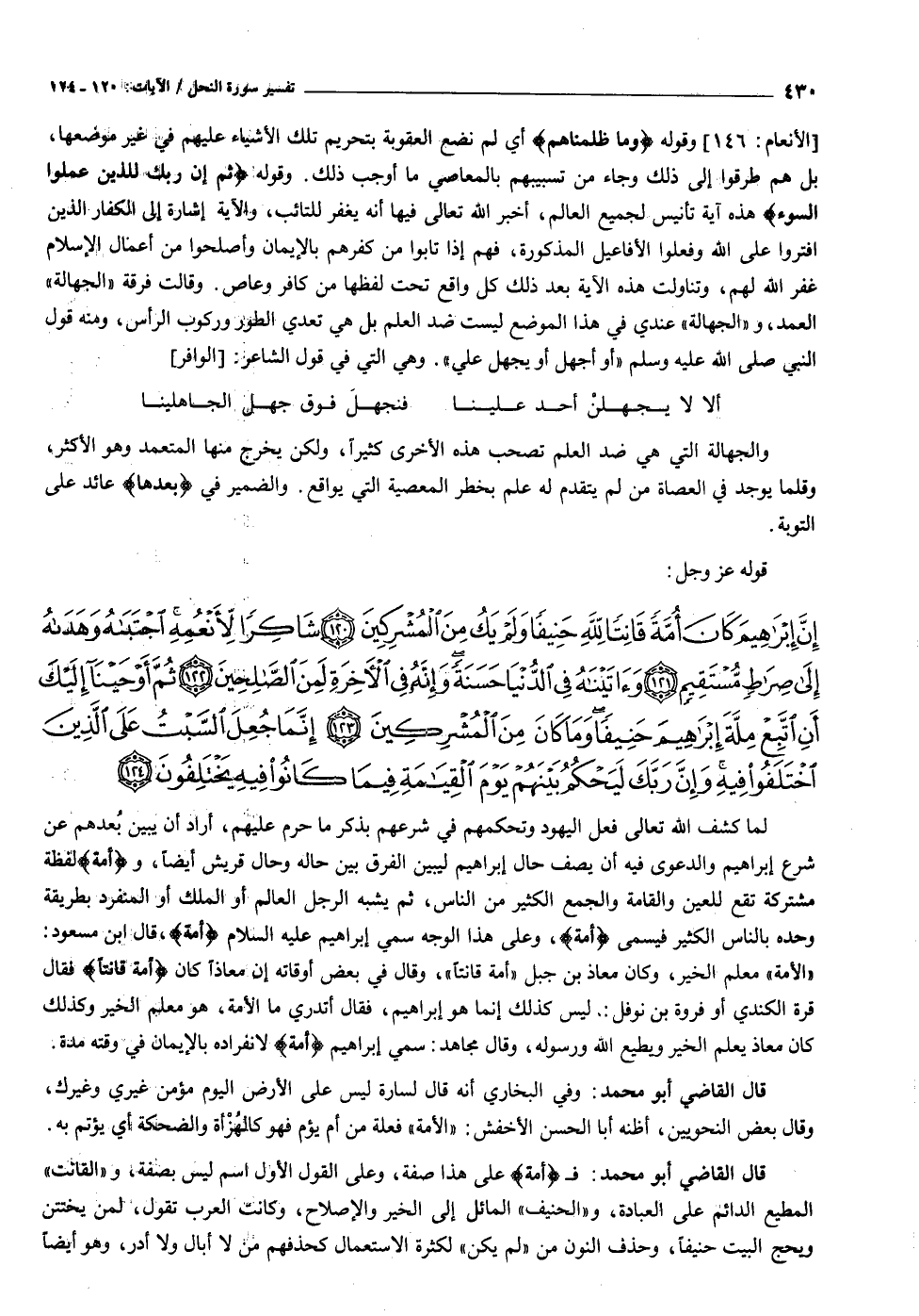 إِنَّ إِبْراهِيمَ كانَ أُمَّةً قانِتاً لِلَّهِ حَنِيفاً وَلَمْ يَكُ مِنَ الْمُشْرِكِينَ (١٢٠) شاكِراً لِأَنْعُمِهِ اجْتَباهُ وَهَداهُ إِلى صِراطٍ مُسْتَقِيمٍ (١٢١) وَآتَيْناهُ فِي الدُّنْيا حَسَنَةً وَإِنَّهُ فِي الْآخِرَةِ لَمِنَ الصَّالِحِينَ (١٢٢) ثُمَّ أَوْحَيْنا إِلَيْكَ أَنِ اتَّبِعْ مِلَّةَ إِبْراهِيمَ حَنِيفاً وَما كانَ مِنَ الْمُشْرِكِينَ (١٢٣) إِنَّما جُعِلَ السَّبْتُ عَلَى الَّذِينَ اخْتَلَفُوا فِيهِ وَإِنَّ رَبَّكَ لَيَحْكُمُ بَيْنَهُمْ يَوْمَ الْقِيامَةِ فِيما كانُوا فِيهِ يَخْتَلِفُونَ (١٢٤)