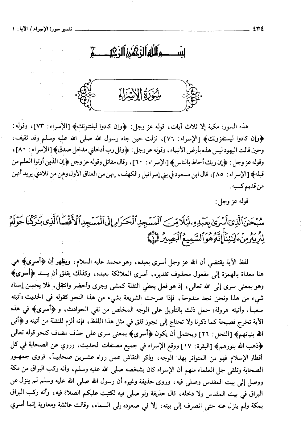 سُبْحانَ الَّذِي أَسْرى بِعَبْدِهِ لَيْلاً مِنَ الْمَسْجِدِ الْحَرامِ إِلَى الْمَسْجِدِ الْأَقْصَى الَّذِي بارَكْنا حَوْلَهُ لِنُرِيَهُ مِنْ آياتِنا إِنَّهُ هُوَ السَّمِيعُ الْبَصِيرُ (١)