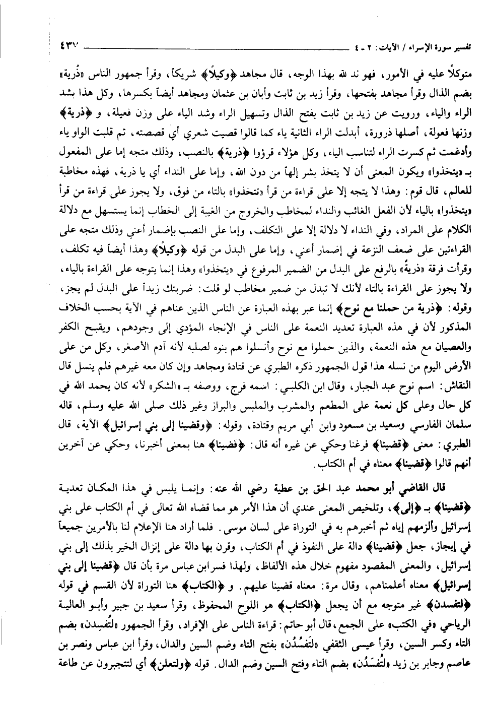 متوكلا عليه في الأمور، فهو ند لله بهذا الوجه، قال مجاهد وَكِيلًا شريكا، وقرأ جمهور الناس «ذرية» بضم الذال وقرأ مجاهد بفتحها، وقرأ زيد بن ثابت وأبان بن عثمان ومجاهد أيضا بكسرها، وكل هذا بشد الراء والياء، ورويت عن زيد بن ثابت بفتح الذال وتسهيل الراء وشد الياء على وزن فعيلة، وذُرِّيَّةَ وزنها فعولة، أصلها ذرورة، أبدلت الراء الثانية ياء كما قالوا قصيت شعري أي قصصته، ثم قلبت الواو ياء وأدغمت ثم كسرت الراء لتناسب الياء، وكل هؤلاء قرؤوا ذُرِّيَّةَ بالنصب، وذلك متجه إما على المفعول ب «يتخذوا» ويكون المعنى أن لا يتخذ بشر إلها من دون الله، وإما على النداء أي يا ذرية، فهذه مخاطبة للعالم، قال قوم: وهذا لا يتجه إلا على قراءة من قرأ «تتخذوا» بالتاء من فوق، ولا يجوز على قراءة من قرأ «يتخذوا» بالياء لأن الفعل الغائب والنداء لمخاطب والخروج من الغيبة إلى الخطاب إنما يستسهل مع دلالة الكلام على المراد، وفي النداء لا دلالة إلا على التكلف، وإما على النصب بإضمار أعني وذلك متجه على القراءتين على ضعف النزعة في إضمار أعني، وإما على البدل من قوله وَكِيلًا وهذا أيضا فيه تكلف، وقرأت فرقة «ذرية» بالرفع على البدل من الضمير المرفوع في «يتخذوا» وهذا إنما يتوجه على القراءة بالياء، ولا يجوز على القراءة بالتاء لأنك لا تبدل من ضمير مخاطب لو قلت: ضربتك زيدا على البدل لم يجز، وقوله: ذُرِّيَّةَ مَنْ حَمَلْنا مَعَ نُوحٍ إنما عبر بهذه العبارة عن الناس الذين عناهم في الآية بحسب الخلاف المذكور لأن في هذه العبارة تعديد النعمة على الناس في الإنجاء المؤدي إلى وجودهم، ويقبح الكفر والعصيان مع هذه النعمة، والذين حملوا مع نوح وأنسلوا هم بنوه لصلبه لأنه آدم الأصغر، وكل من على الأرض اليوم من نسله هذا قول الجمهور ذكره الطبري عن قتادة ومجاهد وإن كان معه غيرهم فلم ينسل قال النقاش: اسم نوح عبد الجبار، وقال ابن الكلبي: اسمه فرج، ووصفه ب «الشكر» لأنه كان يحمد الله في كل حال وعلى كل نعمة على المطعم والمشرب والملبس والبراز وغير ذلك صلى الله عليه وسلم، قاله سلمان الفارسي وسعيد بن مسعود وابن أبي مريم وقتادة، وقوله: وَقَضَيْنا إِلى بَنِي إِسْرائِيلَ الآية، قال الطبري: معنى قَضَيْنا فرغنا وحكي عن غيره أنه قال: قَضَيْنا هنا بمعنى أخبرنا، وحكي عن آخرين أنهم قالوا قَضَيْنا معناه في أم الكتاب.