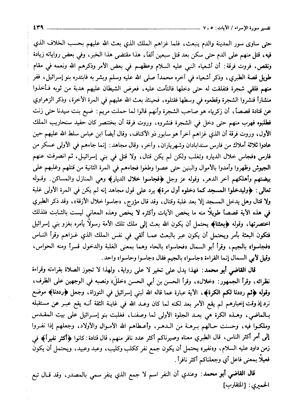حتى ساوى سور المدينة والدم ينبعث، فلما غزاهم الملك الذي بعث الله عليهم بحسب الخلاف الذي فيه، قتل منهم على الدم حتى سكن بعد قتل سبعين ألفا، هذا مقتضى هذا الخبر، وفي بعض رواياته زيادة ونقص، فروت فرقة: أن أشعياء النبي عليه السلام وعظهم في بعض الأمر وذكرهم الله ونعمه في مقام طويل قصة الطبري، وذكر أشعياء في آخره محمدا صلى الله عليه وسلم وبشر به فابتدره بنو إسرائيل، ففر منهم فلقي شجرة فتفلقت له حتى دخلها فالتأمت عليه، فعرض الشيطان عليهم هدبة من ثوبه فأخذوا منشارا فنشروا الشجرة وقطعوه في وسطها فقتلوه، فحينئذ بعث الله عليهم في المرة الآخرة، وذكر الزهراوي عن قتادة قصصا، أن زكرياء هو صاحب الشجرة وأنهم قالوا لما حملت مريم: ضيع بنت سيدنا حتى زنت فطلبوه فهرب منهم حتى دخل في الشجرة فنشروه، وروت فرقة أن بختنصر كان حفيد سنحاريب الملك الأول، وروت فرقة أن الذي غزاهم آخرا هو سابور ذو الأكناف، وقال أيضا ابن عباس سلط الله عليهم حين عادوا ثلاثة أملاك من فارس سندابادان وشهرياران، وآخر، وقال مجاهد: إنما جاءهم في الأولى عسكر من فارس «فجاس خلال الديار» وتغلب ولكن لم يكن قتال، ولا قتل في بني إسرائيل، ثم انصرفت عنهم الجيوش وظهروا وأمدوا بالأموال والبنين حتى عصوا وطغوا فجاءهم في المرة الثانية من قتلهم وغلبهم على بيضتهم وأهلكهم آخر الدهر، وقوله عز وجل فَجاسُوا خِلالَ الدِّيارِ وهي المنازل والمساكن. وقوله تعالى: وَلِيَدْخُلُوا الْمَسْجِدَ كَما دَخَلُوهُ أَوَّلَ مَرَّةٍ يرد على قول مجاهد إنه لم يكن في المرة الأولى غلبة ولا قتال وهل يدخل المسجد إلا بعد غلبة وقتال، وقد قال مؤرج، «جاسوا خلال الأزقة» ، وقد ذكر الطبري في هذه الآية قصصا طويلا منه ما يخص الآيات وأكثره لا يخص وهذه المعاني ليست بالثابت فلذلك اختصرتها، وقوله بَعَثْنا يحتمل أن يكون الله بعث إلى ملك تلك الأمة رسولا يأمره بغزو بني إسرائيل فتكون البعثة بأمر ويحتمل أن يكون عبر بالبعث عما ألقي في نفس الملك الذي غزاهم وقرأ الناس «فجاسوا» بالجيم، وقرأ أبو السمال «فحاسوا» بالحاء وهما بمعنى الغلبة والدخول قسرا ومنه الحواس، وقيل لأبي السمال إنما القراءة «جاسوا» بالجيم فقال «جاسوا وحاسوا» واحد.