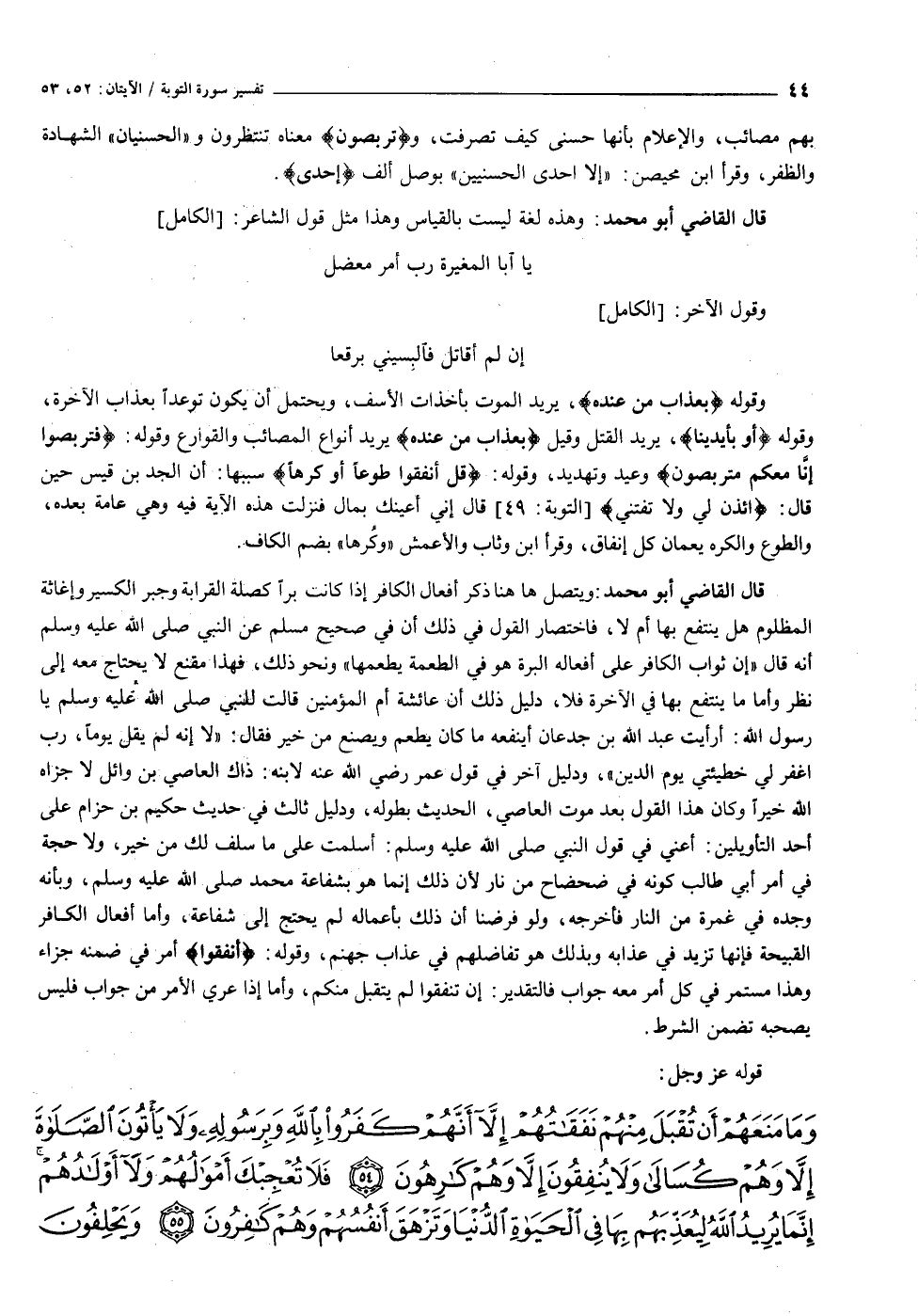 قال القاضي أبو محمد: وهذه لغة ليست بالقياس وهذا مثل قول الشاعر: [الكامل] يا أبا المغيرة رب أمر معضل وقول الآخر: [الكامل] إن لم أقاتل فالبسيني برقعا وقوله بِعَذابٍ مِنْ عِنْدِهِ، يريد الموت بأخذات الأسف، ويحتمل أن يكون توعدا بعذاب الآخرة، وقوله أَوْ بِأَيْدِينا، يريد القتل وقيل بِعَذابٍ مِنْ عِنْدِهِ يريد أنواع المصائب والقوارع وقوله: فَتَرَبَّصُوا إِنَّا مَعَكُمْ مُتَرَبِّصُونَ وعيد وتهديد، وقوله: قُلْ أَنْفِقُوا طَوْعاً أَوْ كَرْهاً سببها: أن الجد بن قيس حين قال: ائْذَنْ لِي وَلا تَفْتِنِّي [التوبة: ٤٩] قال إني أعينك بمال فنزلت هذه الآية فيه وهي عامة بعده، والطوع والكره يعمان كل إنفاق، وقرأ ابن وثاب والأعمش «وكرها» بضم الكاف.