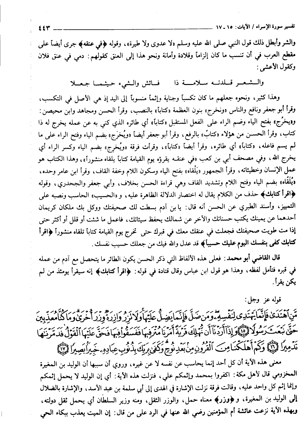 مَنِ اهْتَدى فَإِنَّما يَهْتَدِي لِنَفْسِهِ وَمَنْ ضَلَّ فَإِنَّما يَضِلُّ عَلَيْها وَلا تَزِرُ وازِرَةٌ وِزْرَ أُخْرى وَما كُنَّا مُعَذِّبِينَ حَتَّى نَبْعَثَ رَسُولاً (١٥) وَإِذا أَرَدْنا أَنْ نُهْلِكَ قَرْيَةً أَمَرْنا مُتْرَفِيها فَفَسَقُوا فِيها فَحَقَّ عَلَيْهَا الْقَوْلُ فَدَمَّرْناها تَدْمِيراً (١٦) وَكَمْ أَهْلَكْنا مِنَ الْقُرُونِ مِنْ بَعْدِ نُوحٍ وَكَفى بِرَبِّكَ بِذُنُوبِ عِبادِهِ خَبِيراً بَصِيراً (١٧)