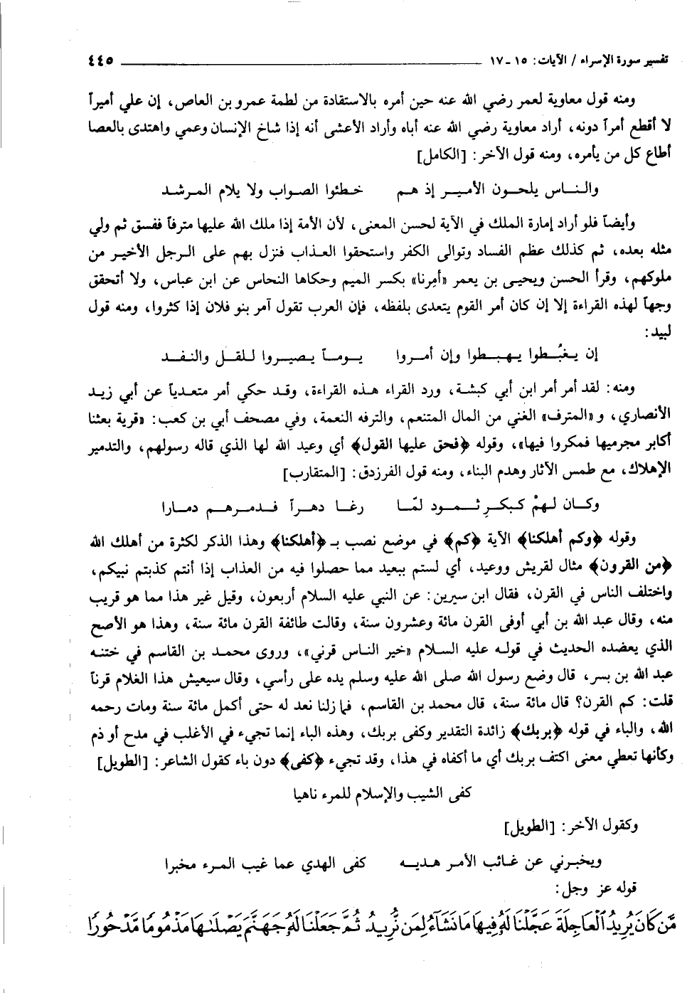 ومنه: لقد أمر أمر ابن أبي كبشة، ورد القراء هذه القراءة، وقد حكي أمر متعديا عن أبي زيد الأنصاري، و «المترف» الغني من المال المتنعم، والترفه النعمة، وفي مصحف أبي بن كعب: «قرية بعثنا أكابر مجرميها فمكروا فيها» ، وقوله فَحَقَّ عَلَيْهَا الْقَوْلُ